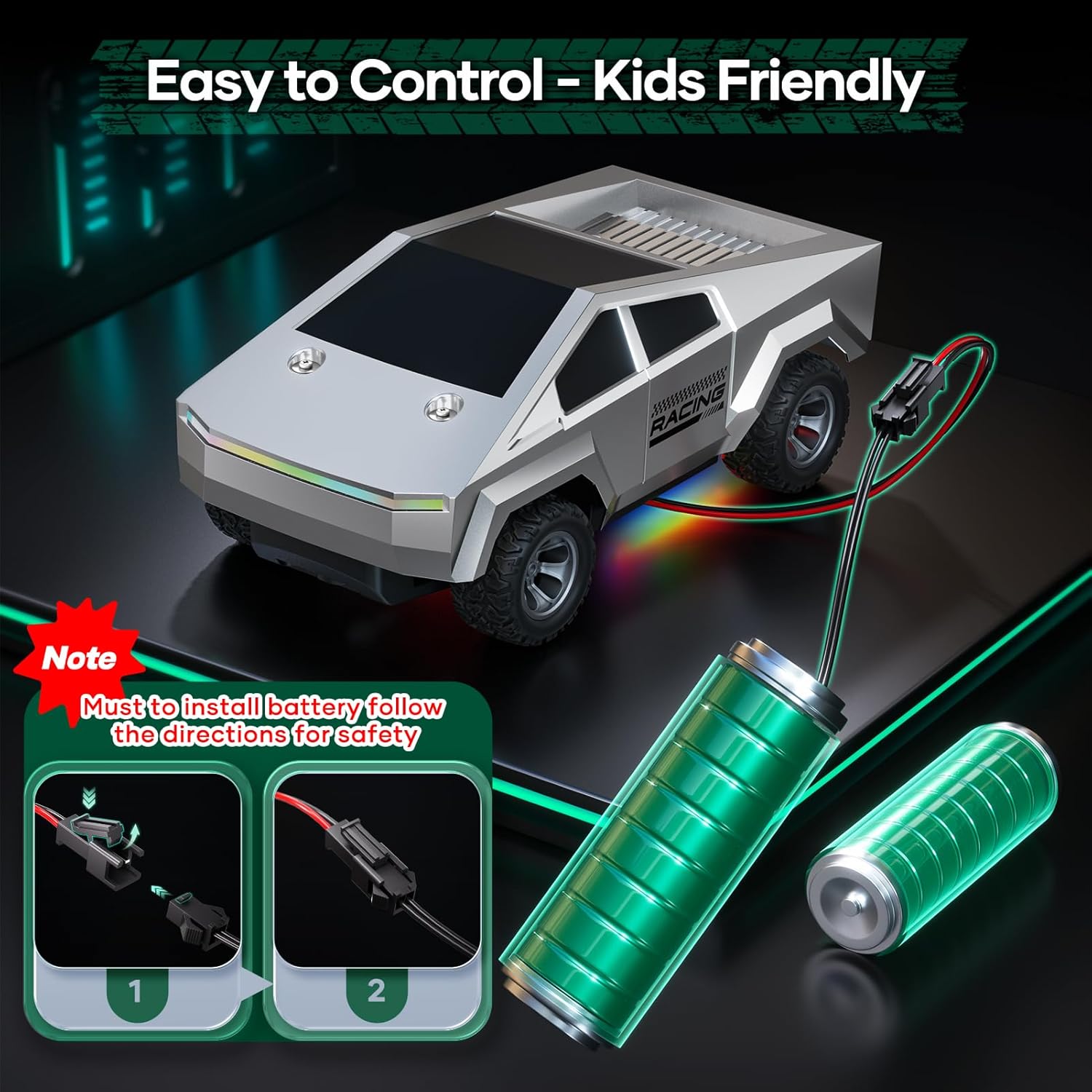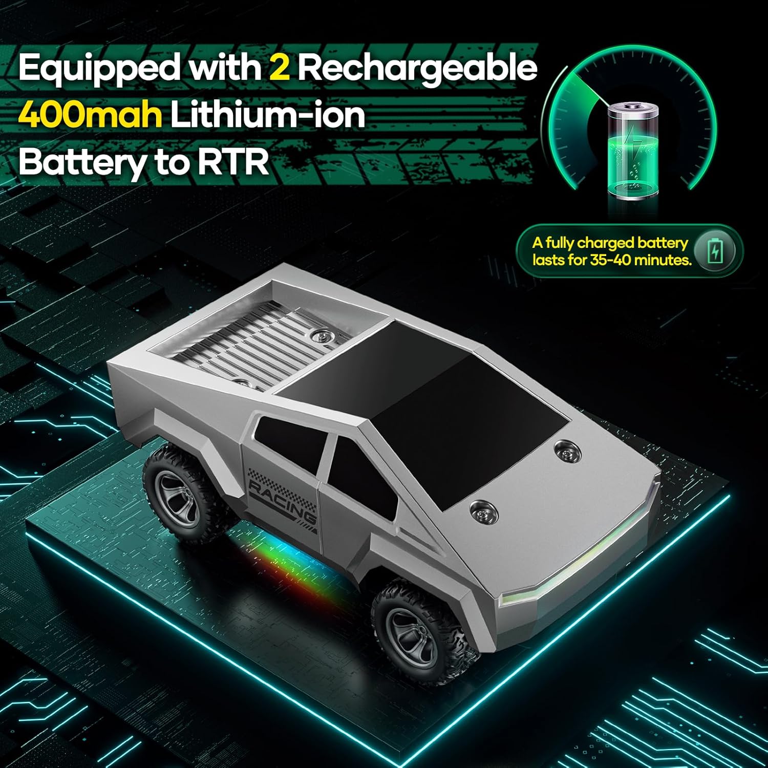 Get ready for adrenaline-pumping adventures with this high-speed 1/24 scale RC pickup truck! Designed for young racing enthusiasts ages 3 and up, this all-terrain monster truck delivers exciting off-road performance with impressive 18 KM/H speed. The durable cold-resistant PVC body ensures year-round fun, while the 2WD front-wheel drive system provides stable handling on grass, dirt, gravel, and more. Featuring vibrant multicolor LED lights, this RC truck lights up the night for epic twilight racing sessions. The ergonomic kid-friendly remote control fits small hands perfectly, offering smooth steering and intuitive control with a 50-meter range thanks to interference-free 2.4GHz technology. Two rechargeable 400mAh batteries deliver up to 60 minutes of continuous playtime, keeping the fun going longer. Perfect birthday, Christmas, or anytime gift for boys and girls who love action-packed outdoor toys!