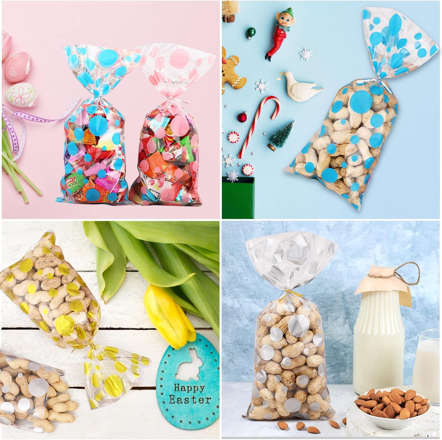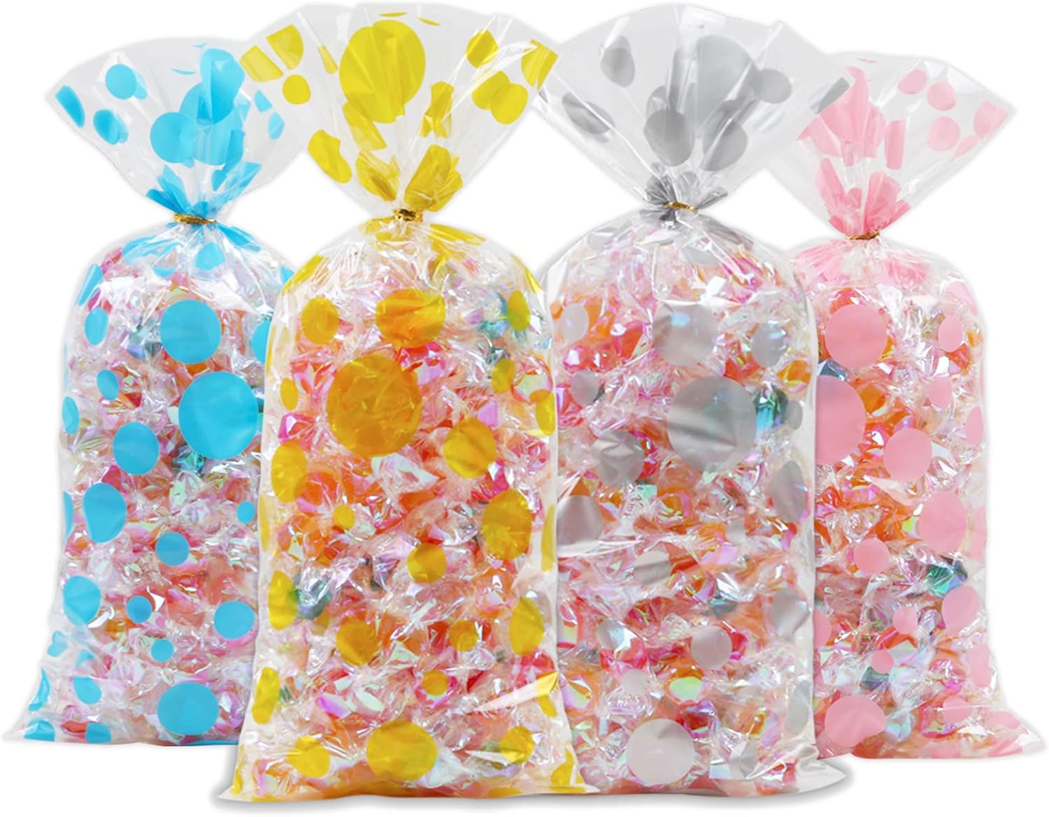 Elevate your gift-giving and party presentations with our premium 120-piece set of Polka Dot Cellophane Bags. Designed for versatility and elegance, these cone-shaped bags feature a chic polka dot pattern available in gold, pink, blue, and silver, adding a touch of sophistication to any occasion. Whether you are wrapping homemade cookies, candies, chocolates, nuts, or small prizes, the crystal-clear OPP material ensures your treats are displayed beautifully while staying fresh.
