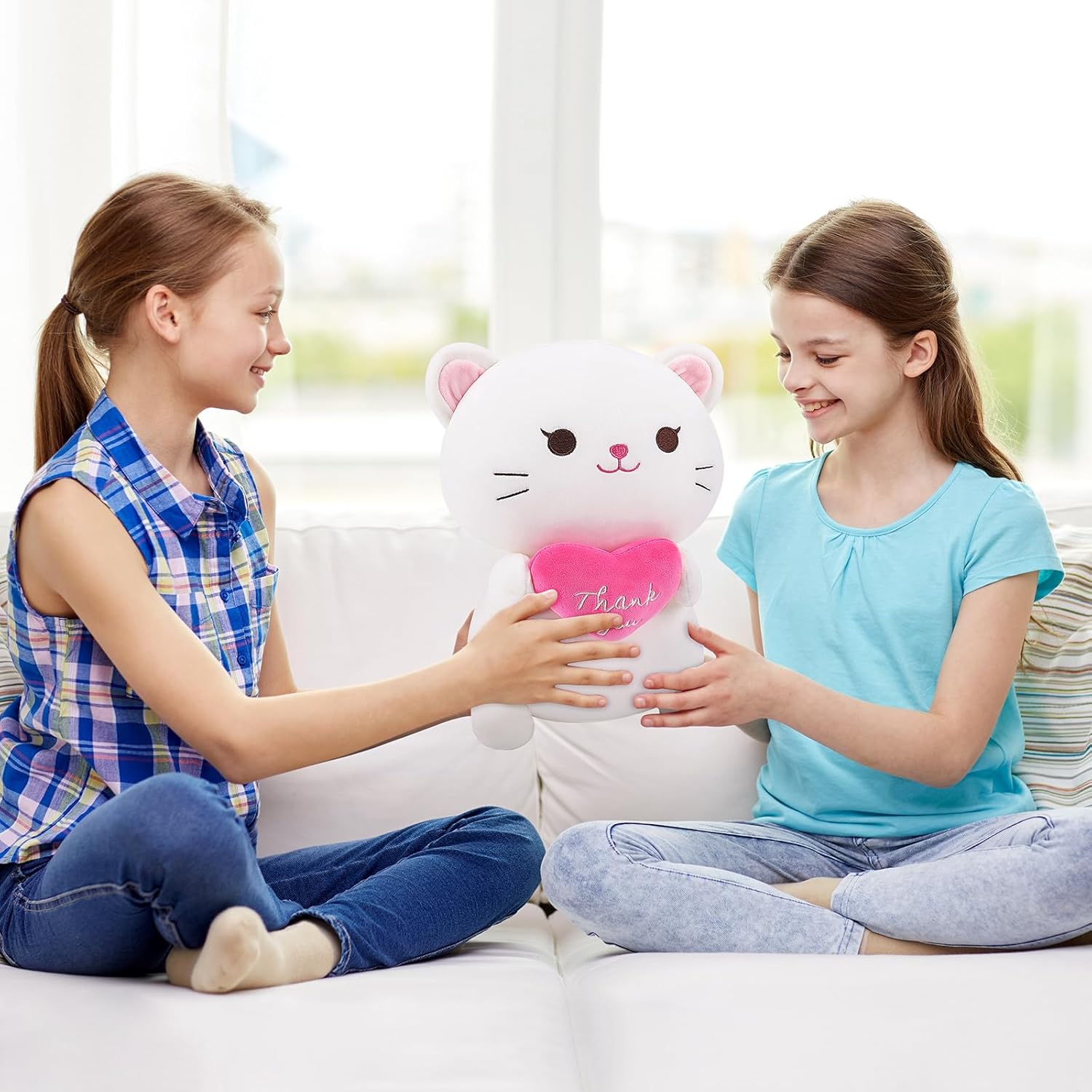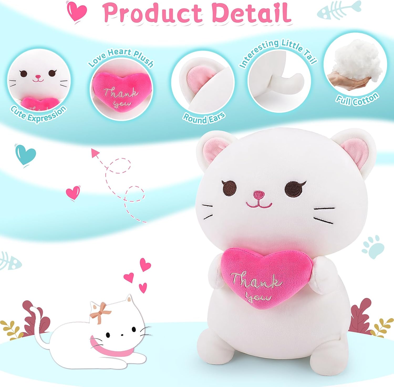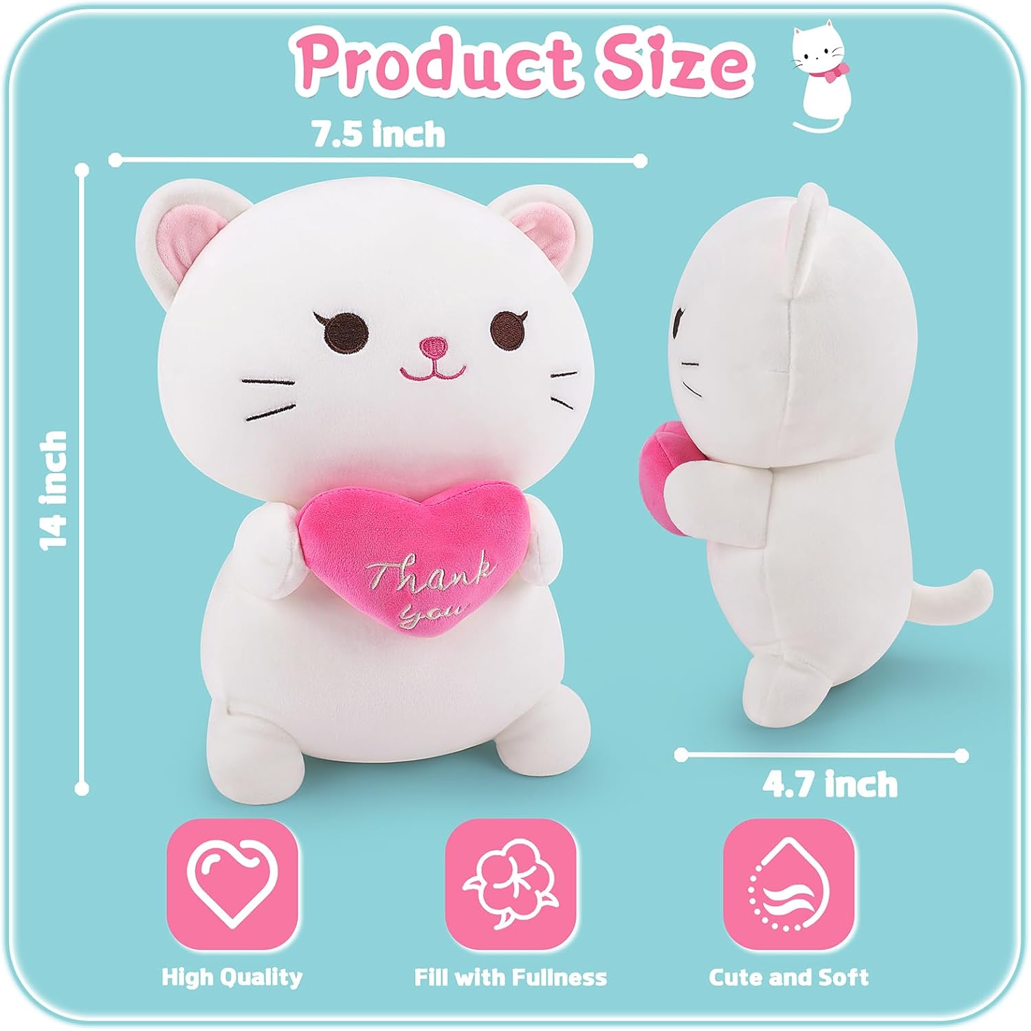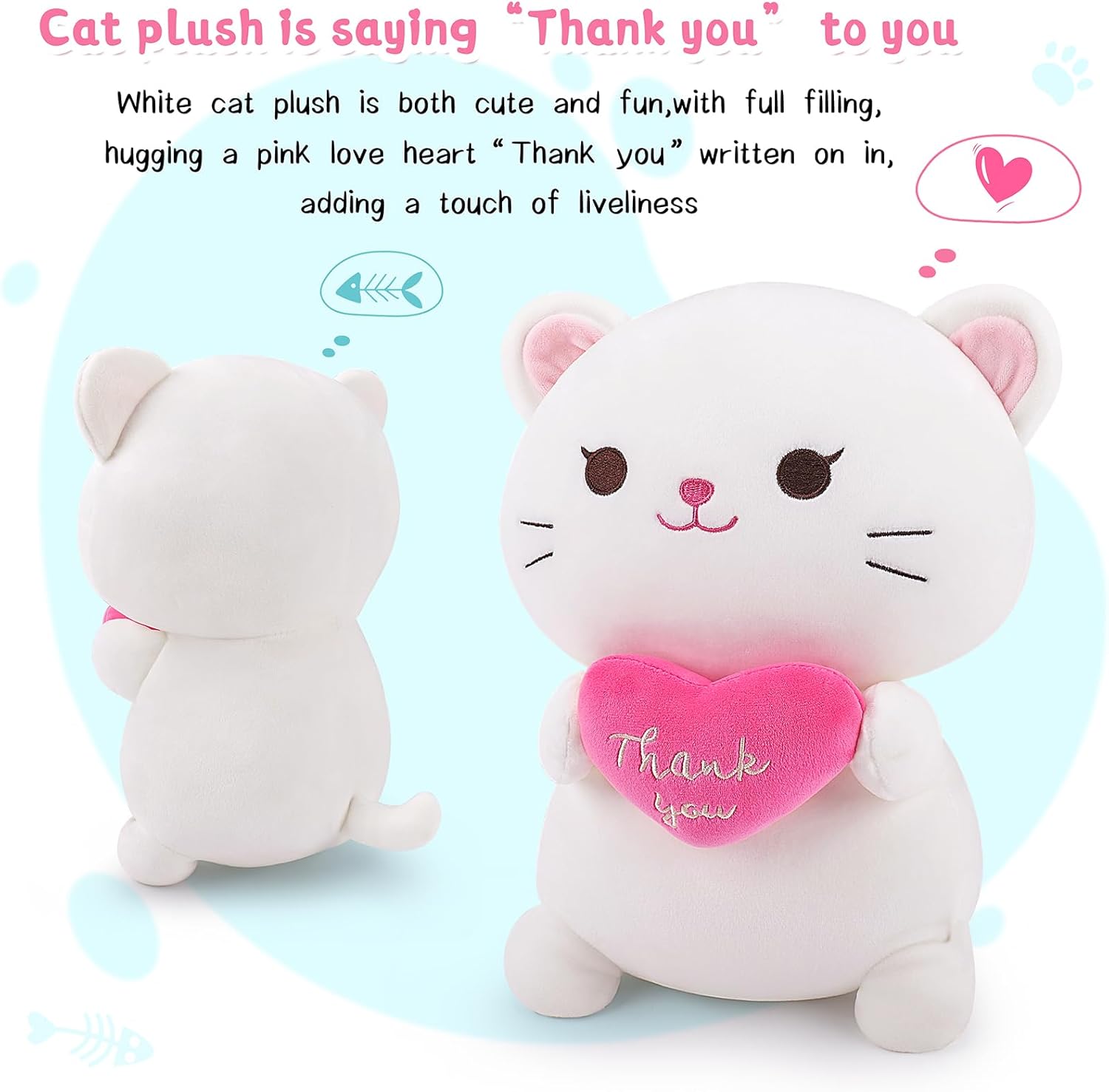 14inch Thank You Cat Plush, Soft White Kawaii Stuffed Animal Pillow, Cute Hugging Kitten Toy Gift for Kids & Adults