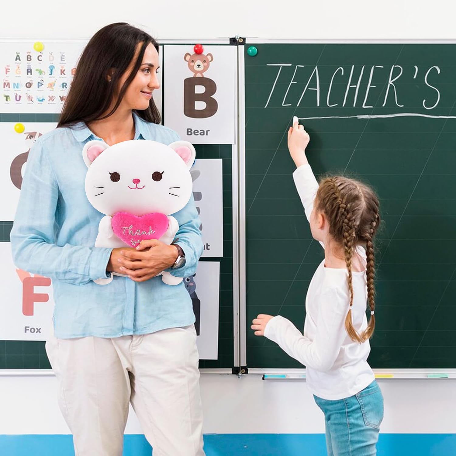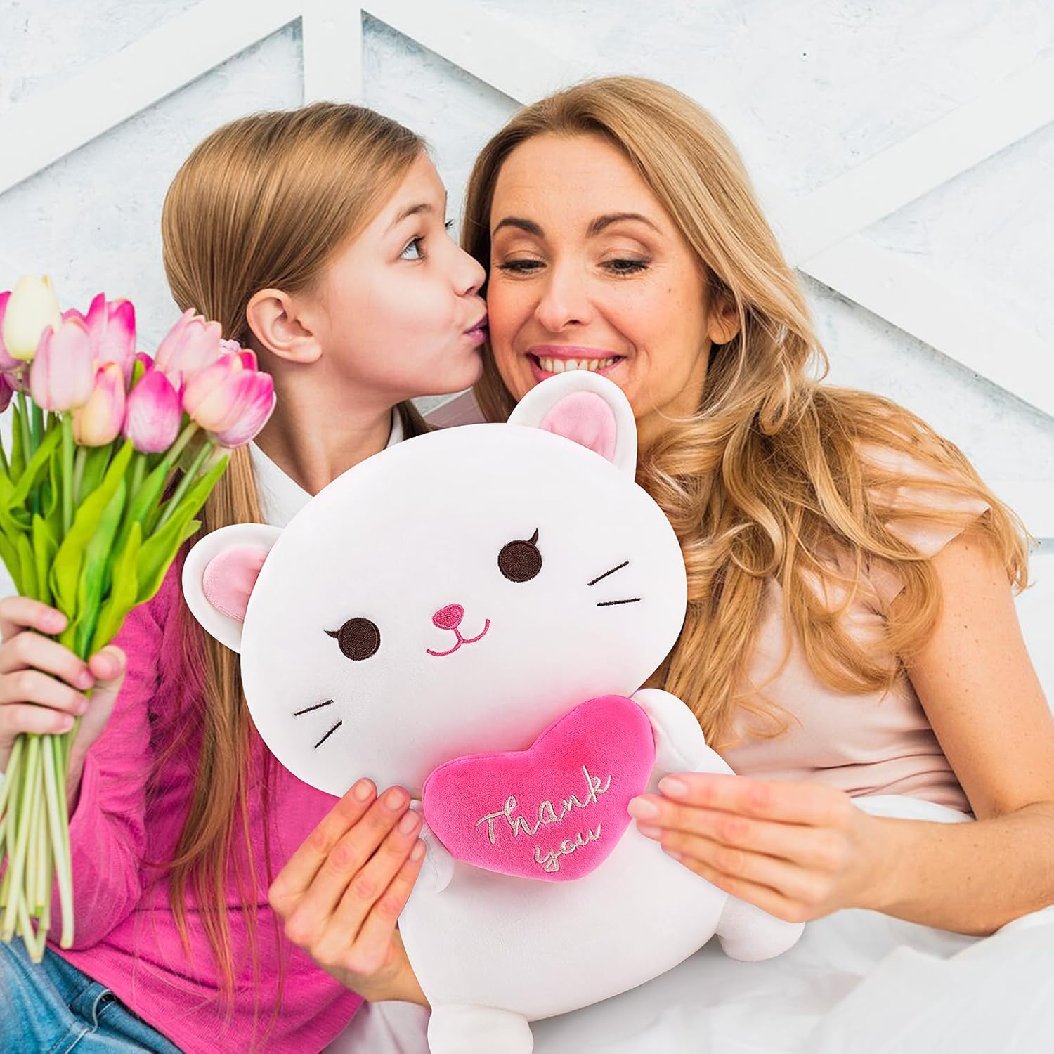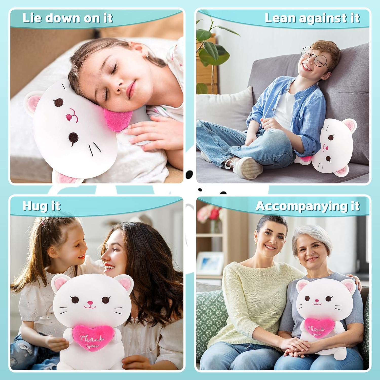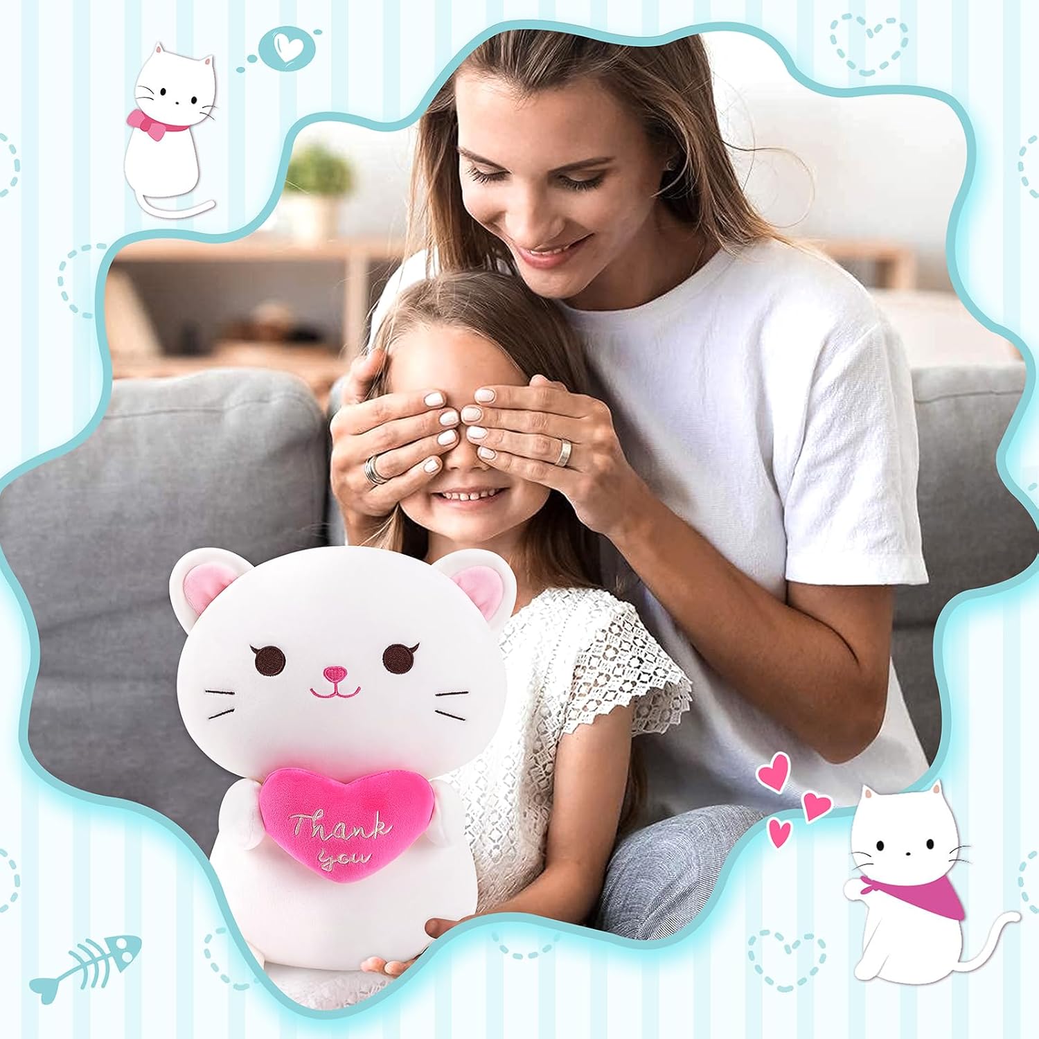 14inch Thank You Cat Plush, Soft White Kawaii Stuffed Animal Pillow, Cute Hugging Kitten Toy Gift for Kids & Adults