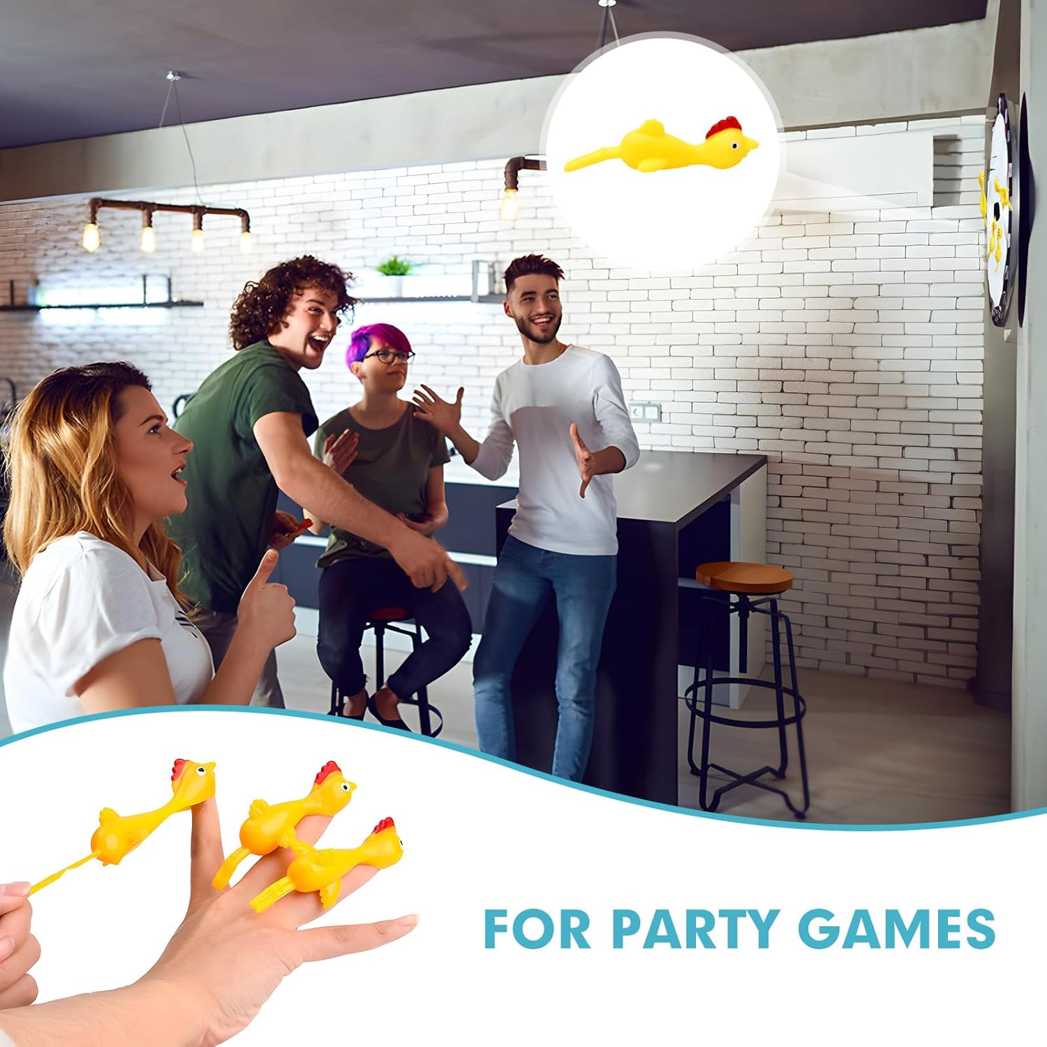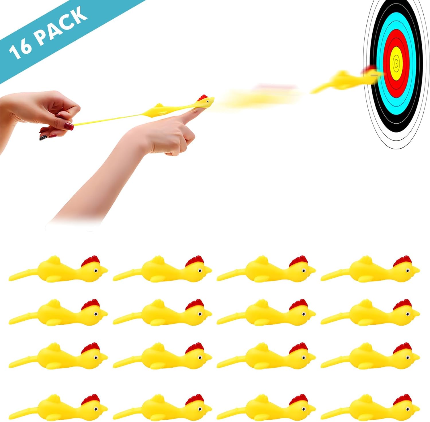 • HIGH-FLYING FUN: Set of 16 stretchy rubber chickens that launch across the room with a simple finger slingshot mechanism.