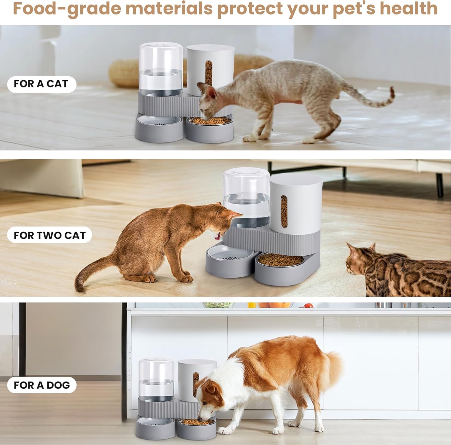 Gravity-Powered Automation: Say goodbye to electrical outlets and complex programming. Our smart gravity design automatically refills the base as your pet eats or drinks. The food dispenser releases kibble as the bowl empties, while the waterer features a sophisticated siphon mechanism that stops the flow once the water reaches the optimal level, preventing messy overflows.