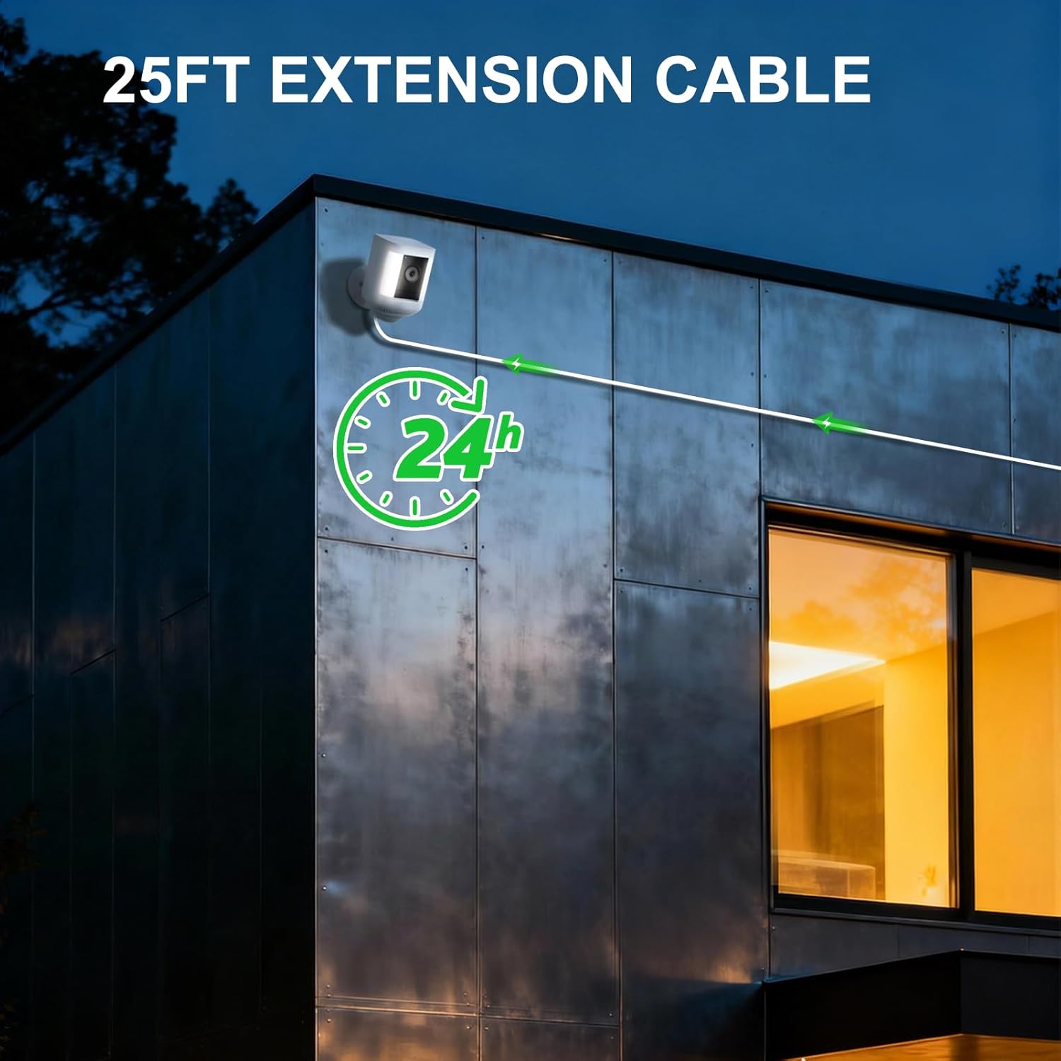 - Extra-Long 25ft Cable: Provides ample length to reach distant outlets, allowing for optimal camera positioning in hard-to-reach outdoor locations.