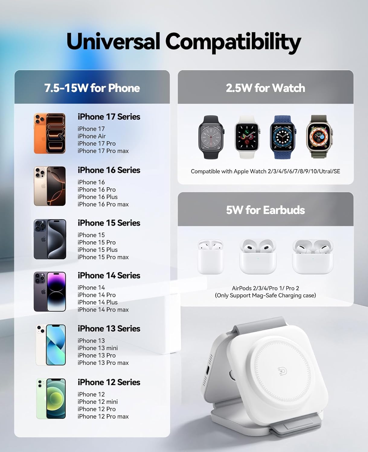 - Wide Compatibility: Supports iPhone 17/16/15/14/13/12, Apple Watch Ultra/10/9/8/7/6/5/4/3/2, and AirPods 4/3/2/Pro.