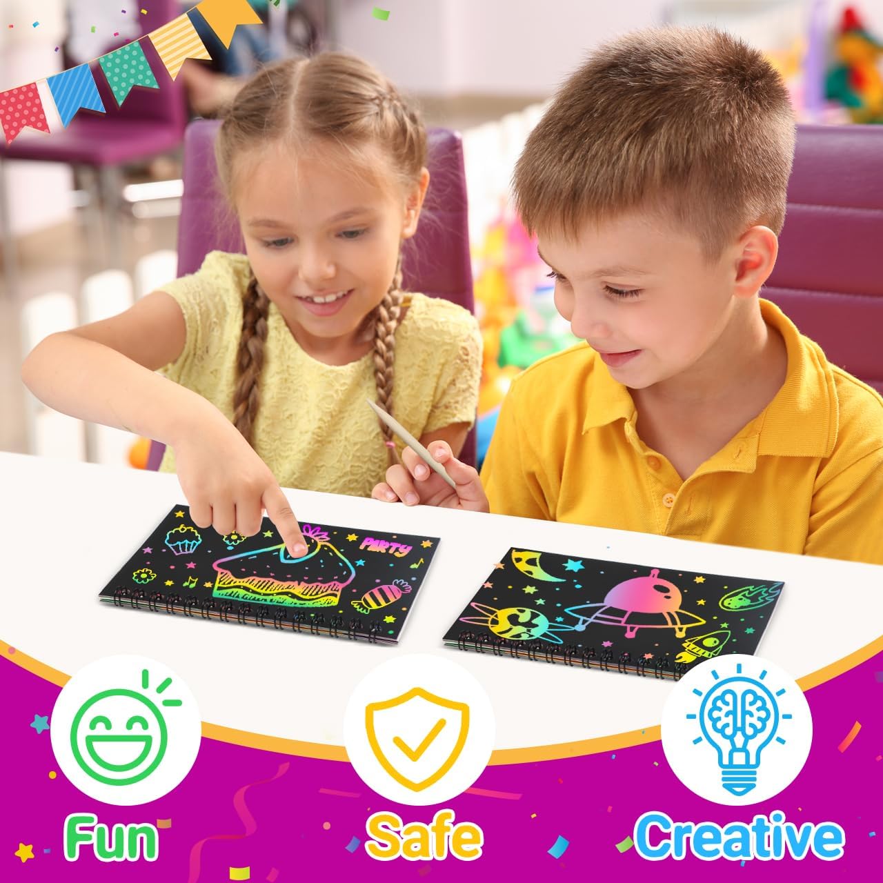 • MESS-FREE CREATIVE FUN: No crayons, markers, or paints required! Kids simply scratch the black surface to reveal bright rainbow colors underneath.