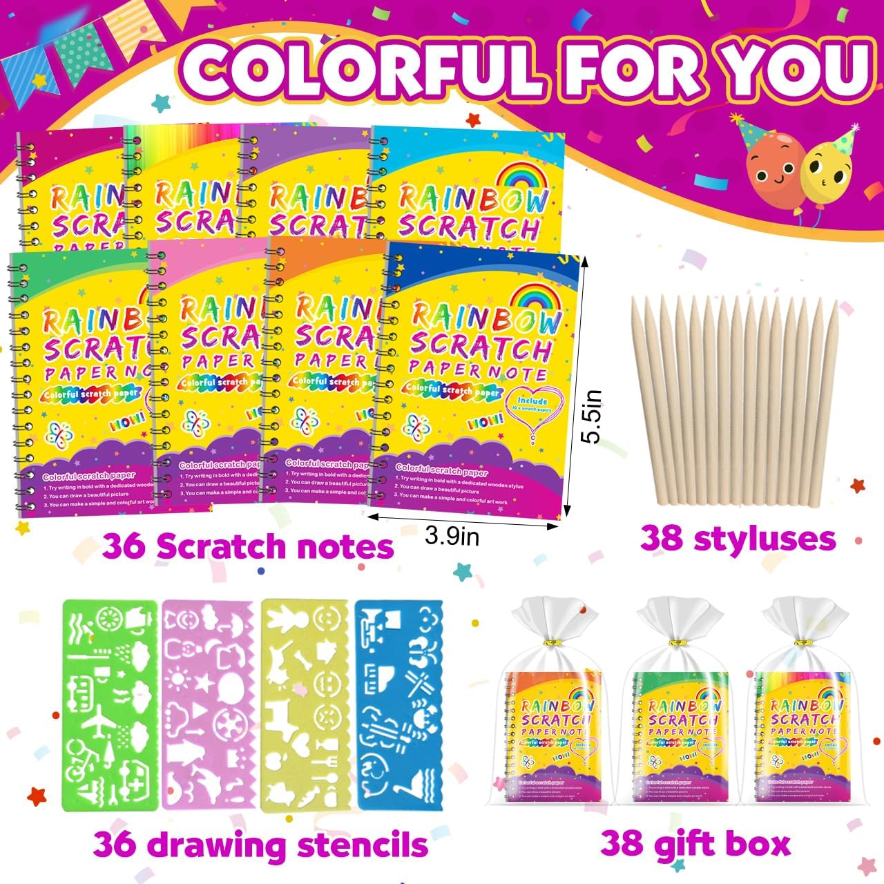 • ULTIMATE 36-PACK BULK SET: Includes 36 rainbow scratch notebooks, 36 drawing stencils, and 38 wooden styluses—perfect for large groups, classrooms, and parties.