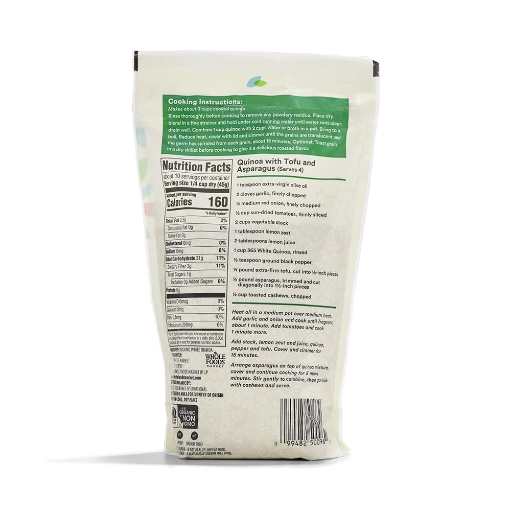 Elevate your meals with 365 by Whole Foods Market Organic White Quinoa. Sourced from the finest sustainable farms, this 16-ounce bag of premium ancient grain offers a complete protein source containing all nine essential amino acids. Our strict quality standards ban over 300 ingredients, ensuring you receive a product free from hydrogenated fats, high-fructose corn syrup, and artificial sweeteners. Quick-cooking and versatile, this quinoa features a delicate, nutty flavor and fluffy texture, making it the perfect nutritious base for salads, side dishes, or a hearty breakfast bowl. Certified Organic and Non-GMO, it is the guilt-free, affordably priced pantry essential your healthy lifestyle demands.