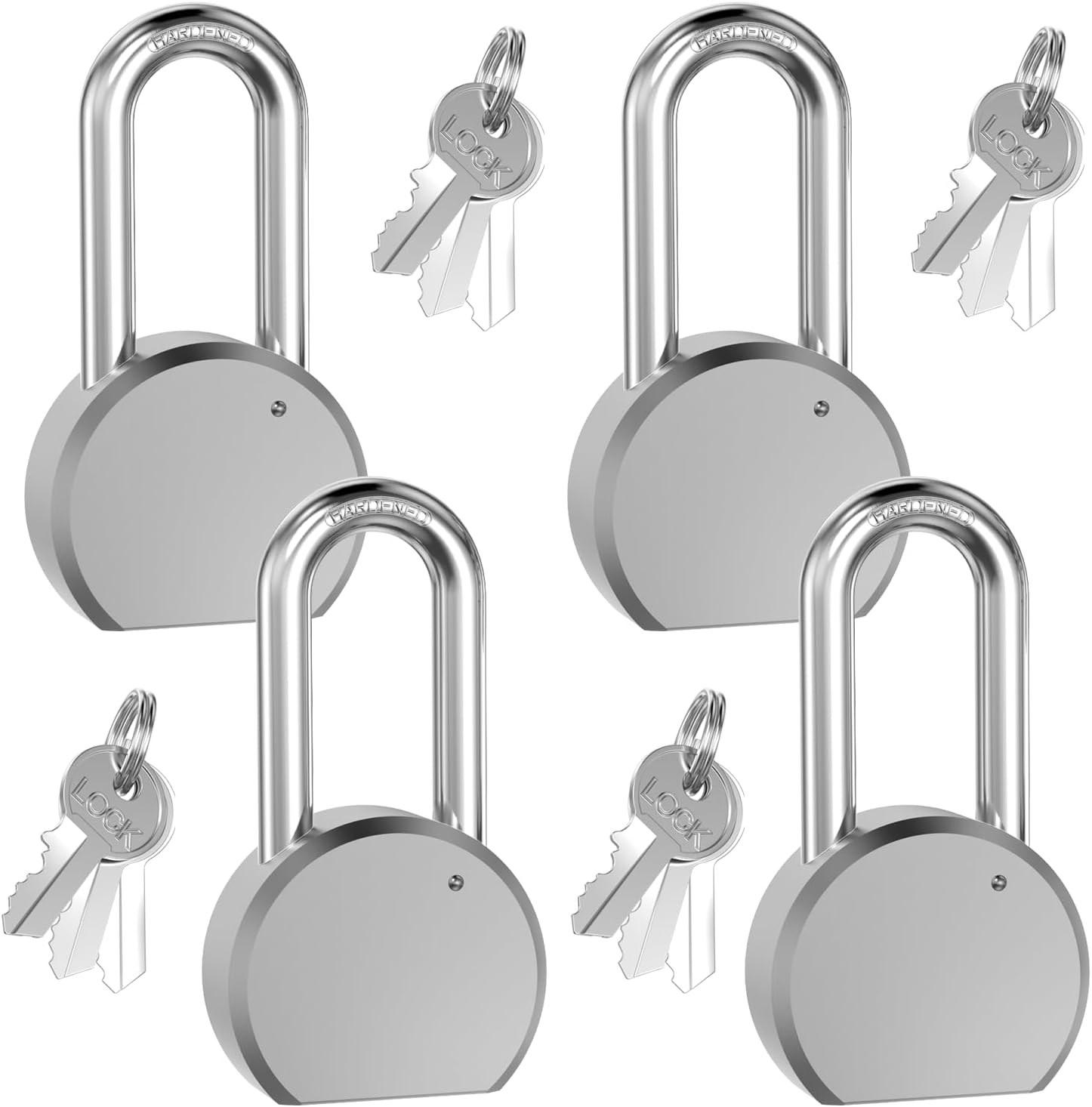 Secure your property with ultimate peace of mind using this 4-pack of Heavy Duty Matte Chrome Padlocks. Engineered for high-performance security, these 2.5-inch (65mm) locks feature a robust solid steel body and a hardened steel shackle designed to resist cutting and sawing, making them ideal for high-theft areas. The sleek matte chrome finish offers superior corrosion resistance, ensuring reliable operation through rain, snow, and humidity. Perfect for securing outdoor gates, chain-link fences, storage units, sheds, warehouses, and heavy-duty toolboxes. Convenience meets security with the Keyed Alike system—all four locks open with a single key, eliminating the hassle of managing multiple keys for different access points.