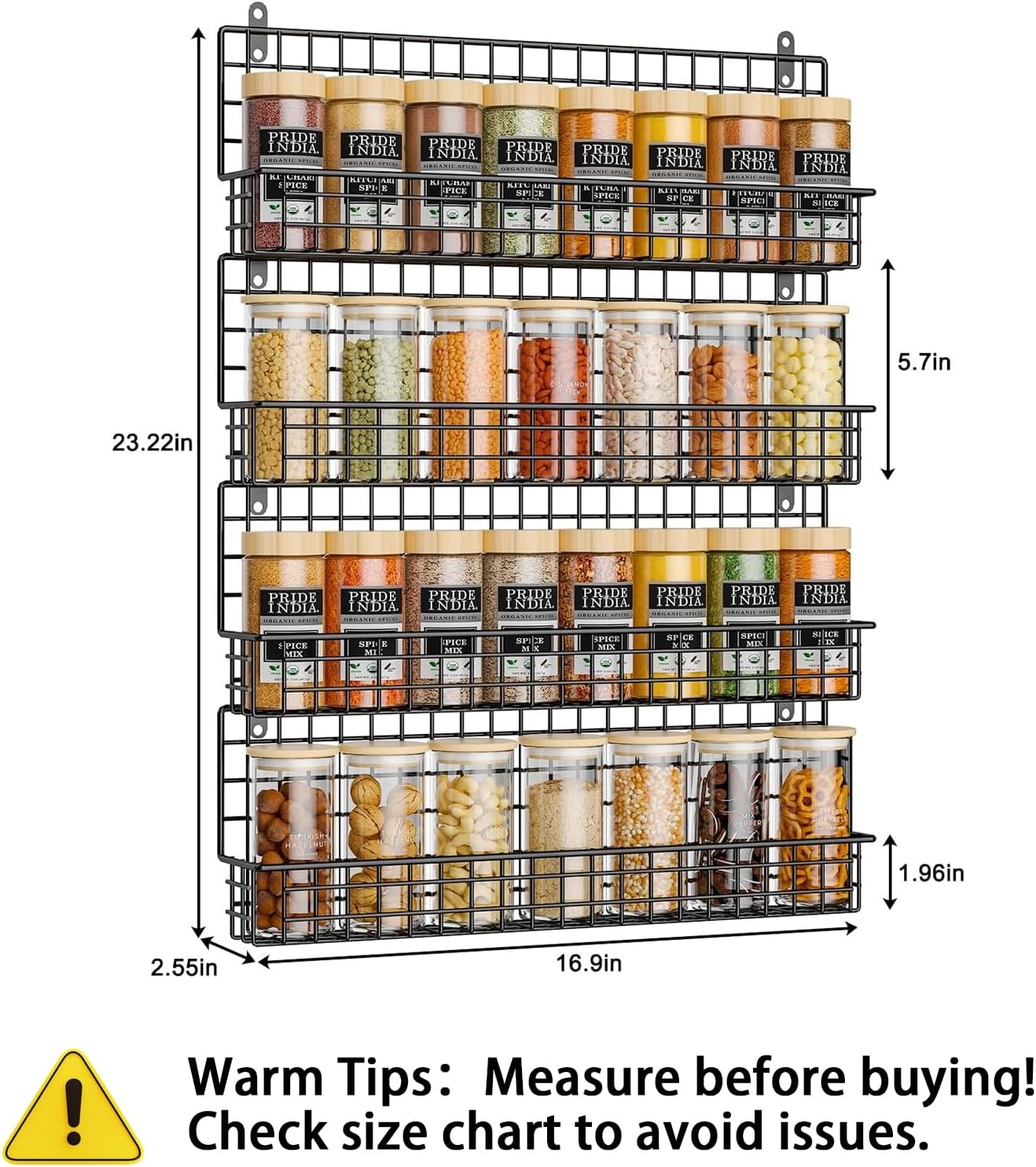 - Massive Capacity: Holds up to 36 standard 6oz spice jars or 32 8oz jars (jars not included). The tiered design ensures labels are clearly visible.