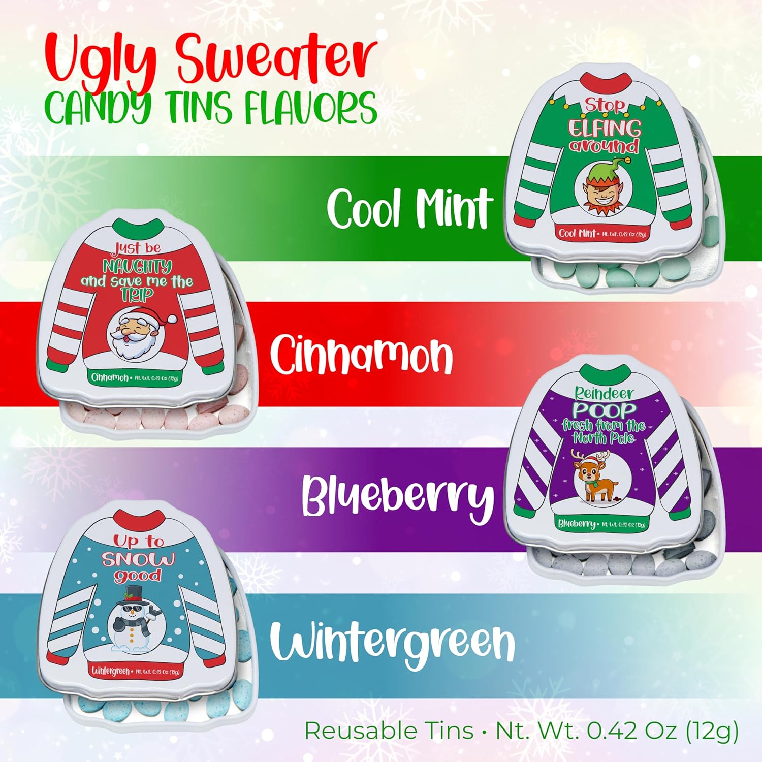ADD SOME MINTY MISCHIEF TO THE HOLIDAYS: Tired of the same old boring Christmas candy? Bring laughter and fresh breath to your festivities with these hilarious ‘Christmas Poop’ mints! Each 4-pack features distinct ‘Ugly Sweater’ styled tins labeled as Reindeer Poop, Snowman Poop, Christmas Tree Poop, and more. They are the ultimate conversation starter and the perfect funny gag gift for adults, teens, and kids who appreciate a good joke.