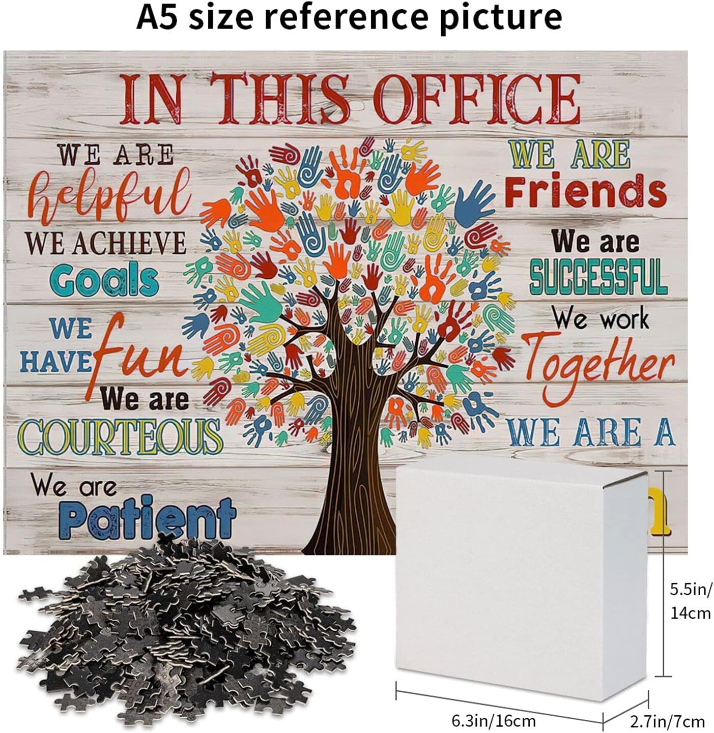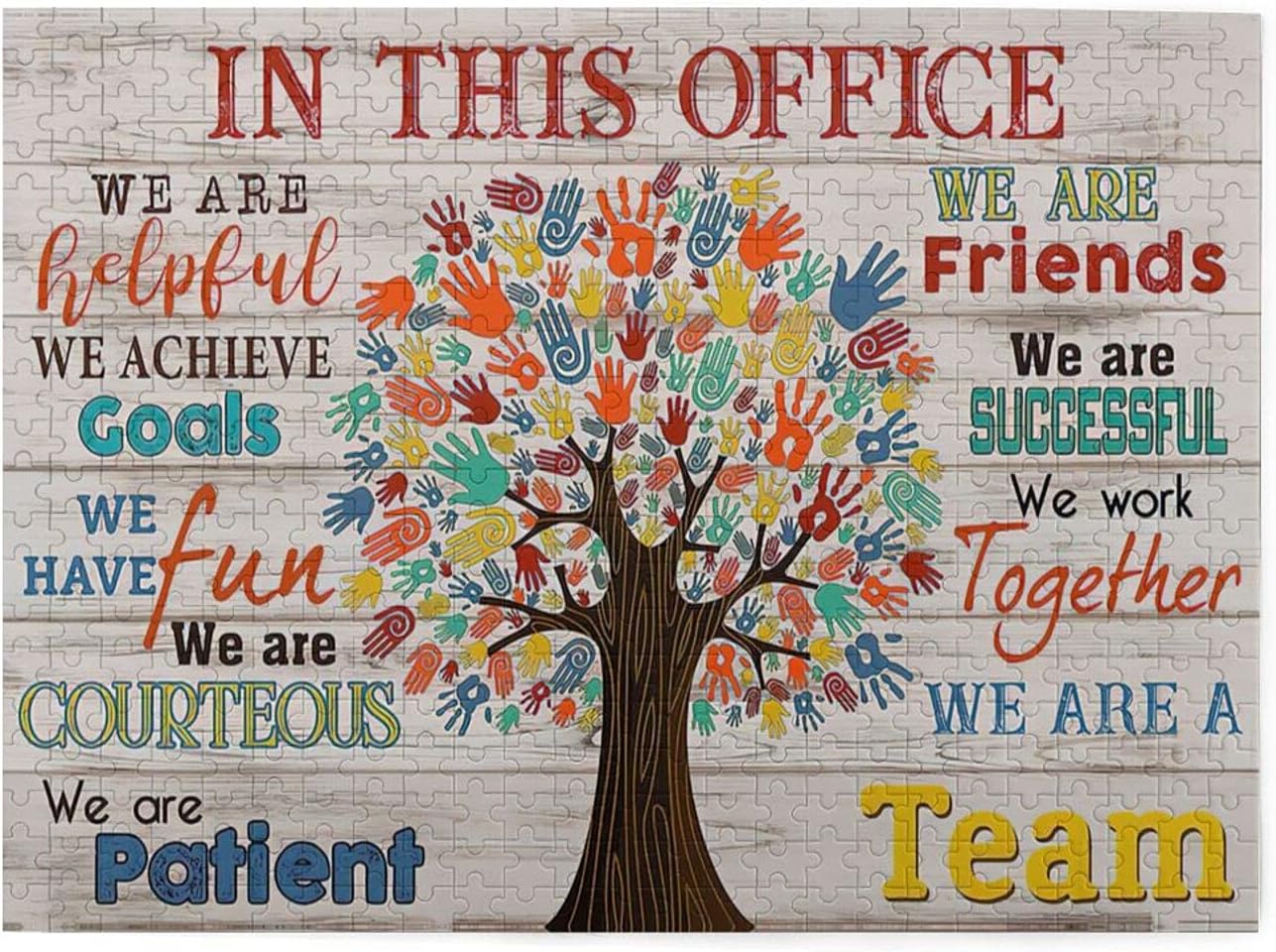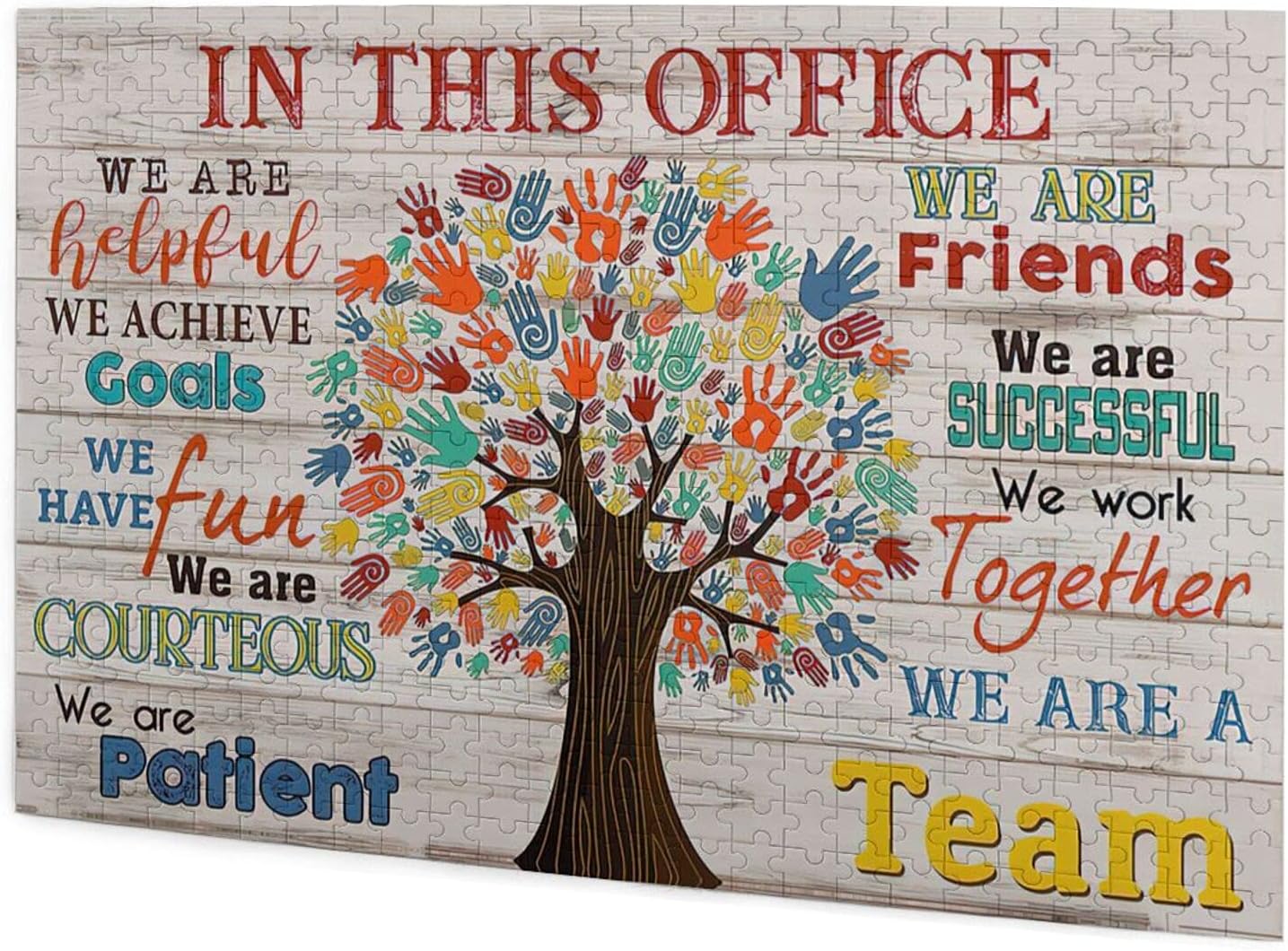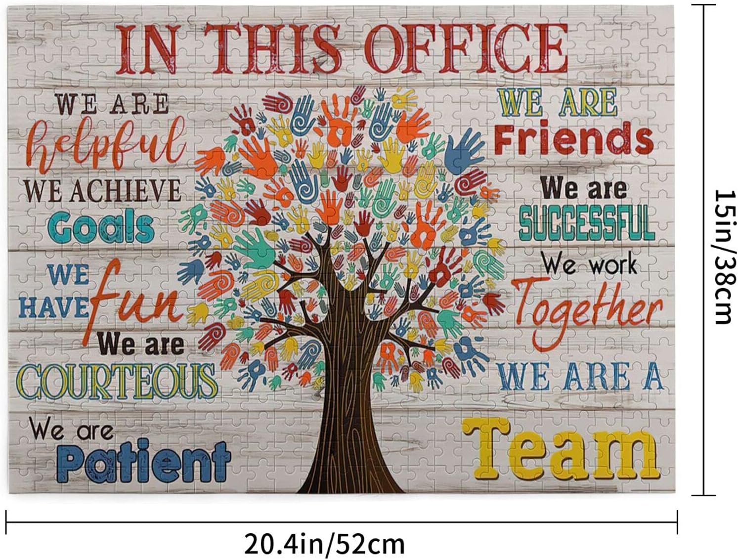 Elevate your office environment and engage your mind with this premium 500-piece wooden jigsaw puzzle. Featuring the motivational message ‘In This Office We Are A Team,’ this puzzle serves as both a stimulating mental challenge and a unique piece of wall art once completed.