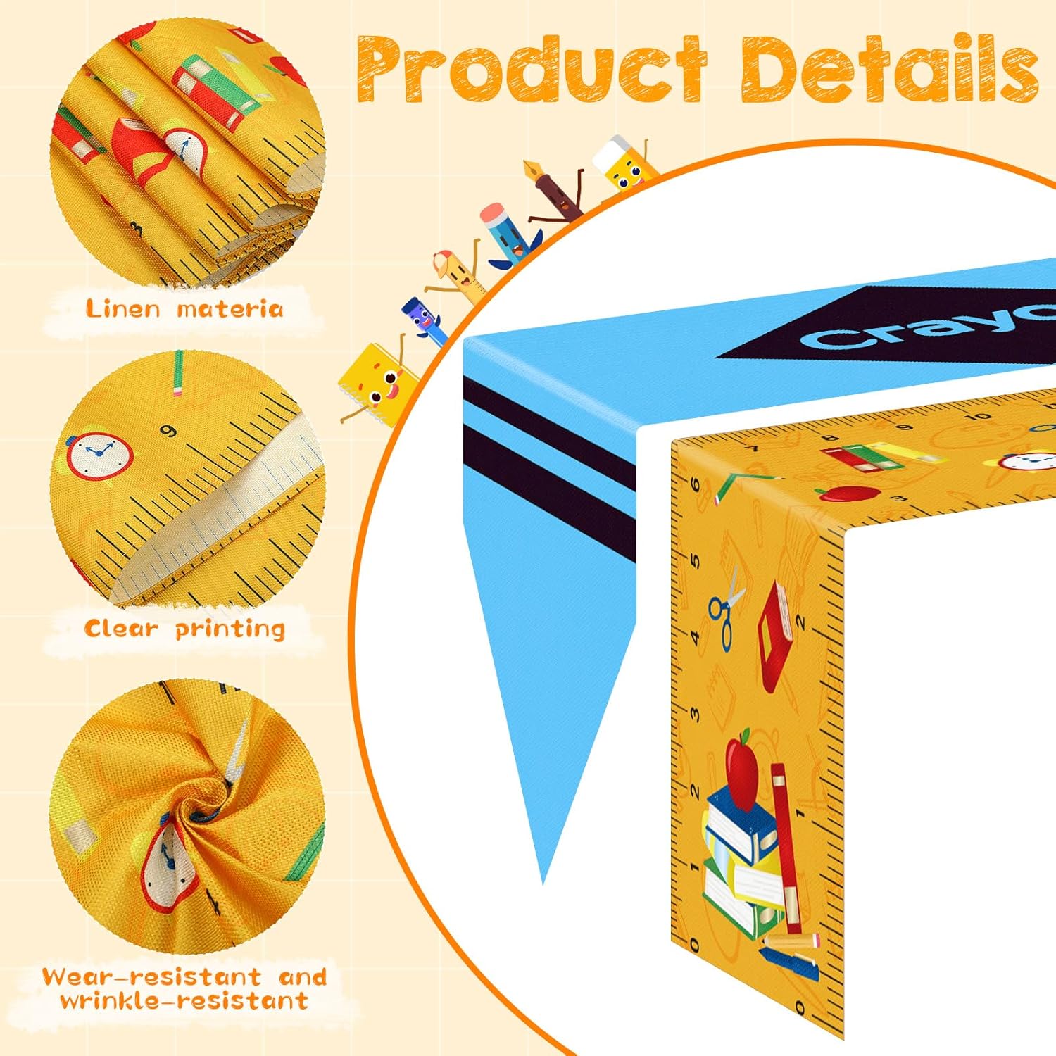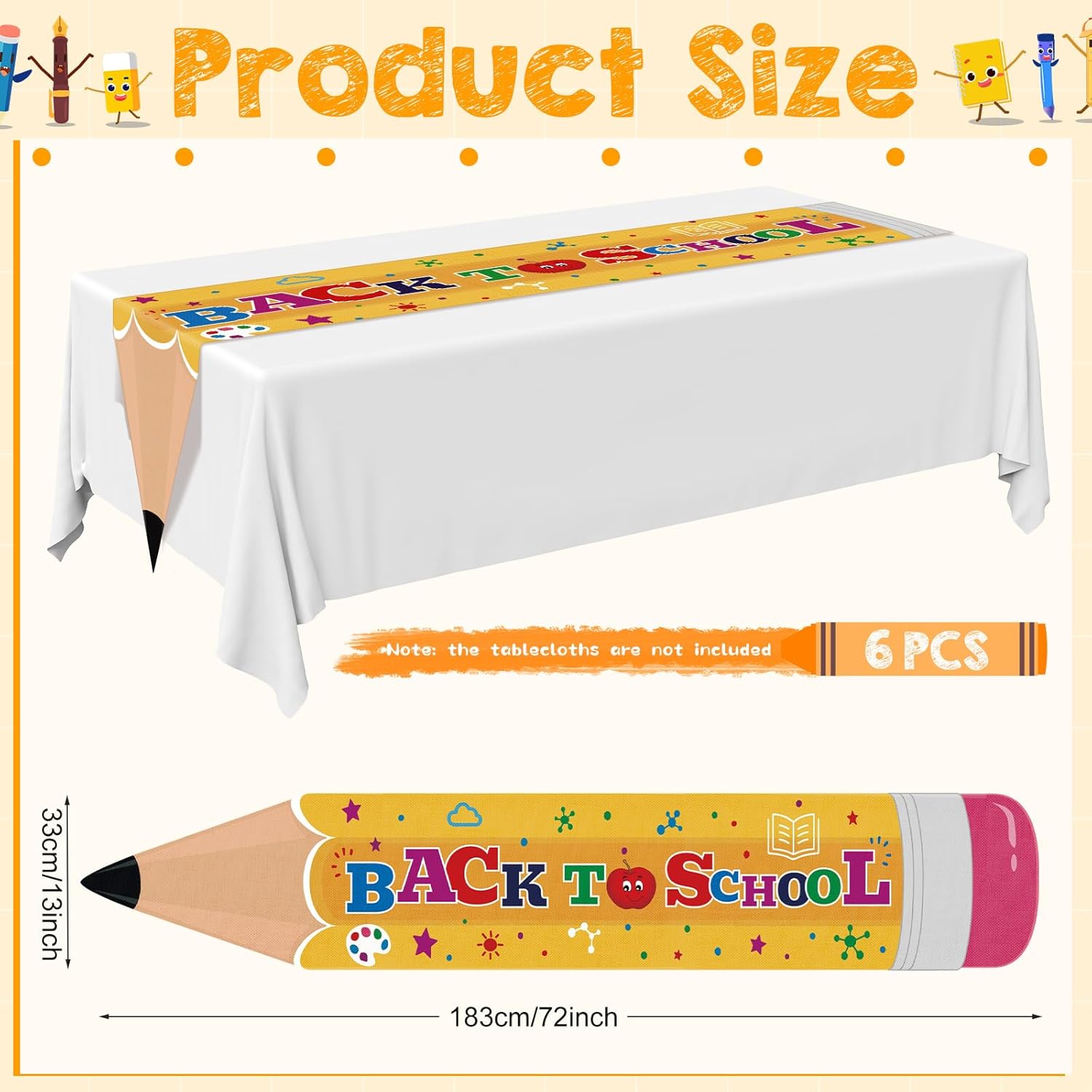 Transform your space into a vibrant educational hub with this 6-piece set of crayon-themed table runners. Measuring 72 x 13 inches, these multicolor linens are the perfect backdrop for celebrating the first day of school, kindergarten graduations, or Teacher Appreciation Day. Crafted from durable linen, they offer a festive yet professional look that requires minimal effort to set up—simply lay them flat to create an instant focal point for photos, dining, or display tables.