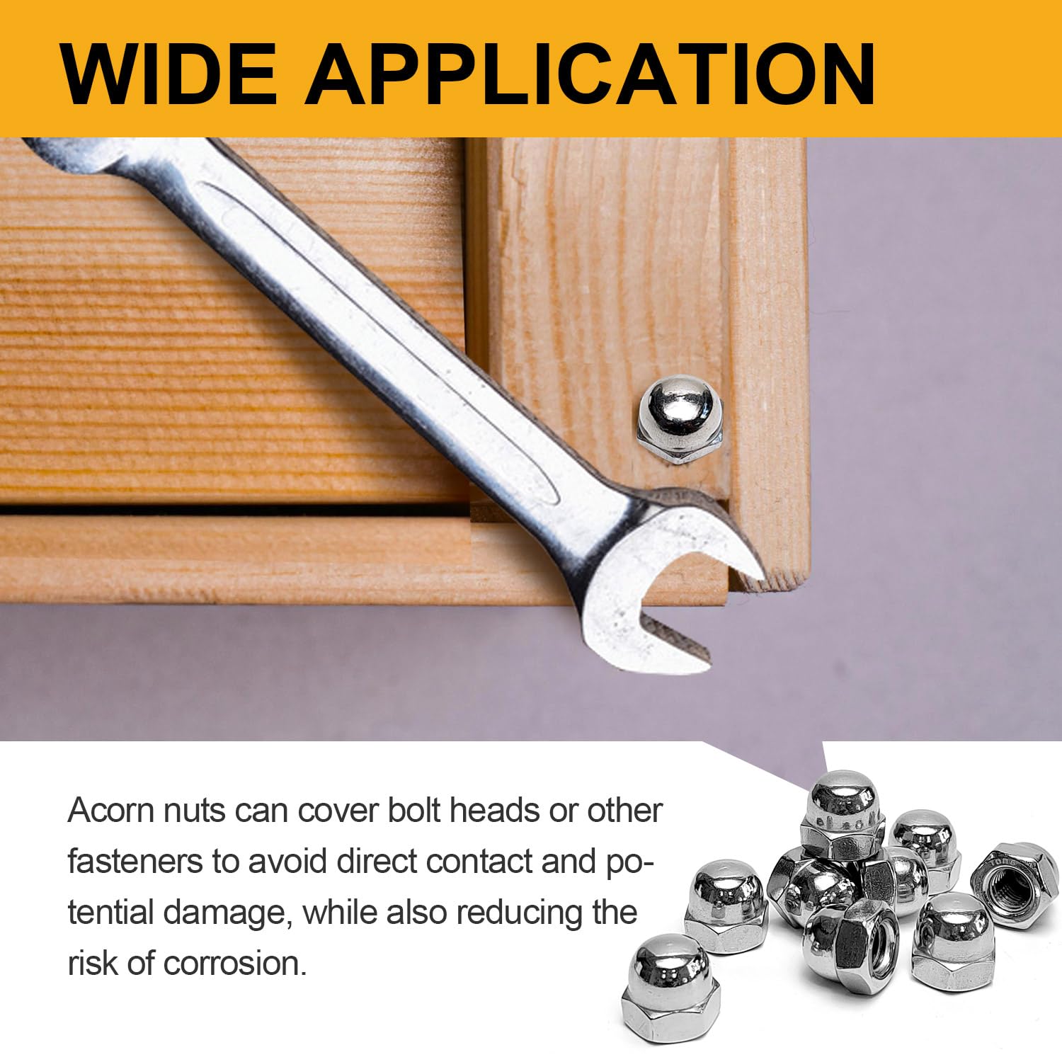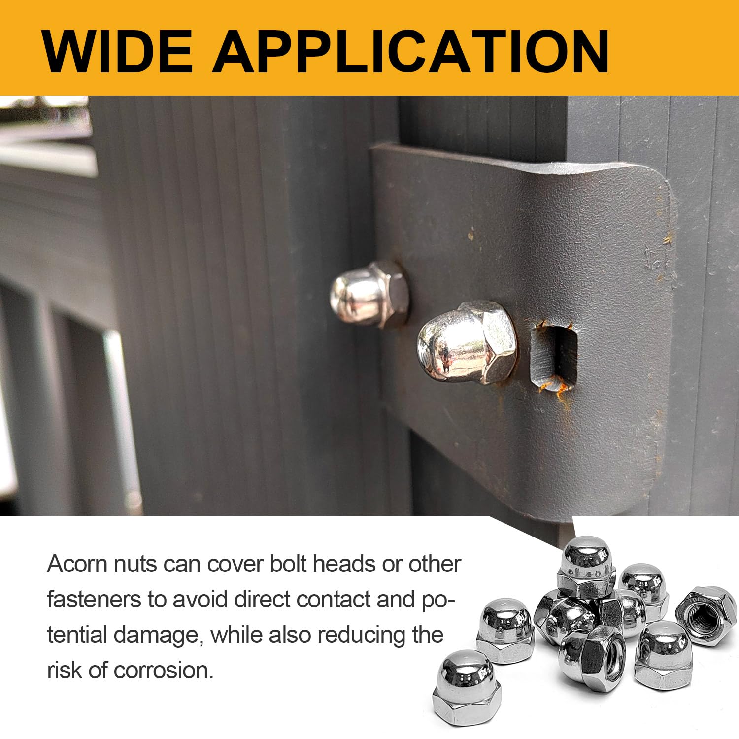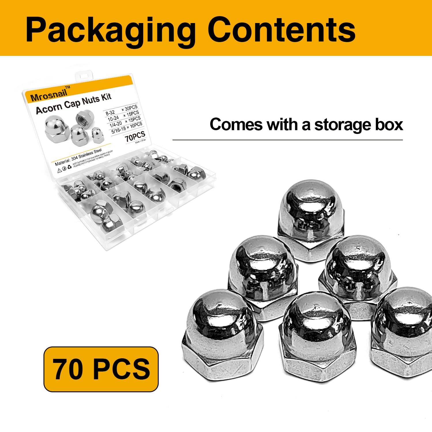 Elevate the safety and aesthetics of your fastening projects with this premium 70-Piece Acorn Nut Assortment Kit. Crafted from high-grade 304 stainless steel, these hex cap nuts are engineered to resist rust and corrosion, making them ideal for use in humid, wet, or harsh outdoor environments. The smooth, low-profile dome head serves a dual purpose: it provides a sleek, finished look that covers exposed threaded ends, preventing injury to passersby and protecting bolt threads from damage.