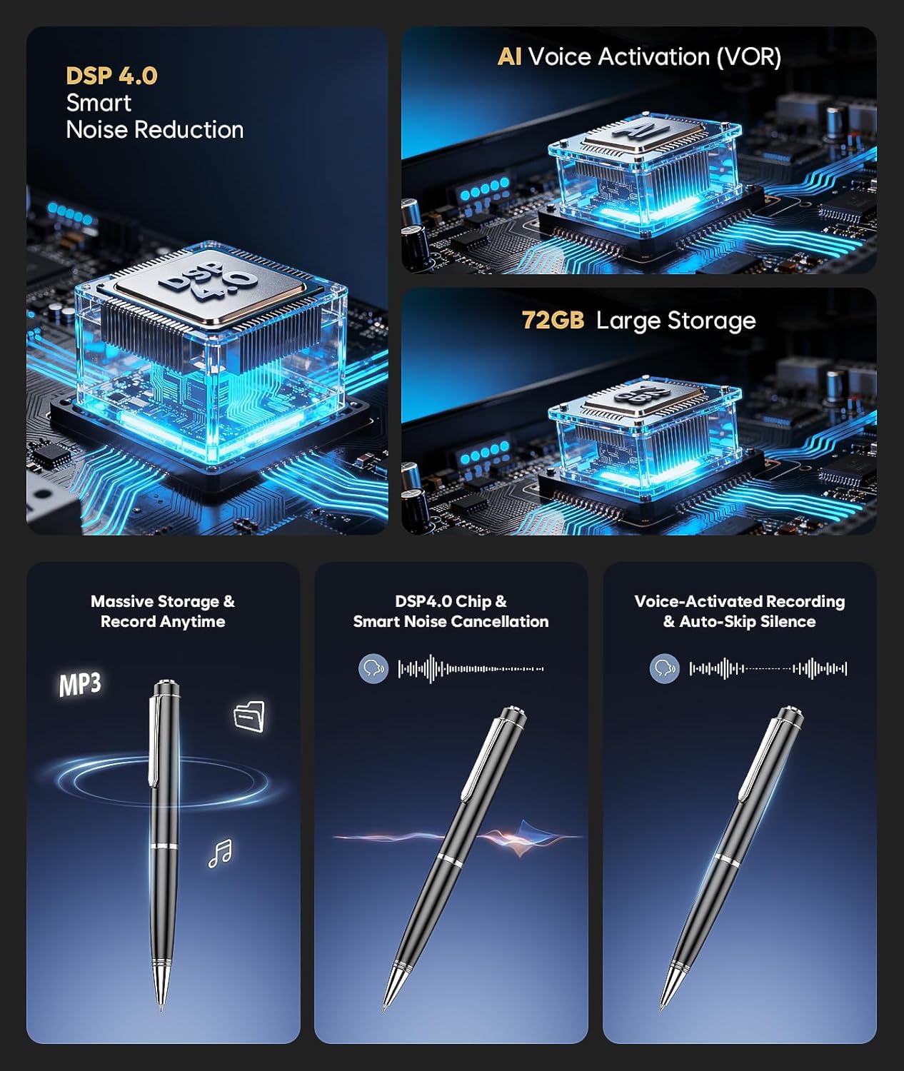 - Smart Voice Activation (VOR): Save storage and battery life with Voice-Activated Recording. The device intuitively starts recording when sound is detected and pauses during silence, making it perfect for hands-free operation.