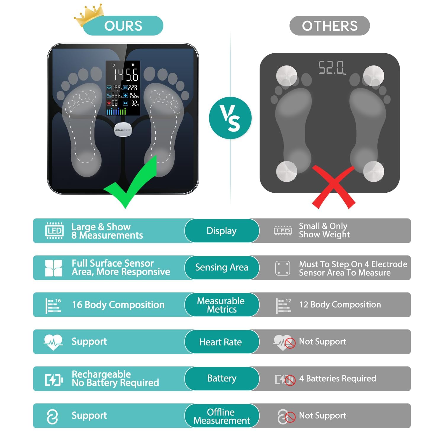 ABLEGRID Smart Body Fat Scale – Rechargeable Digital Bathroom Weight Scale with Large Color Display, 16 Essential Metrics (Heart Rate, BMI, Body Water), 400lb Capacity, Baby Mode, Bluetooth & APP Sync