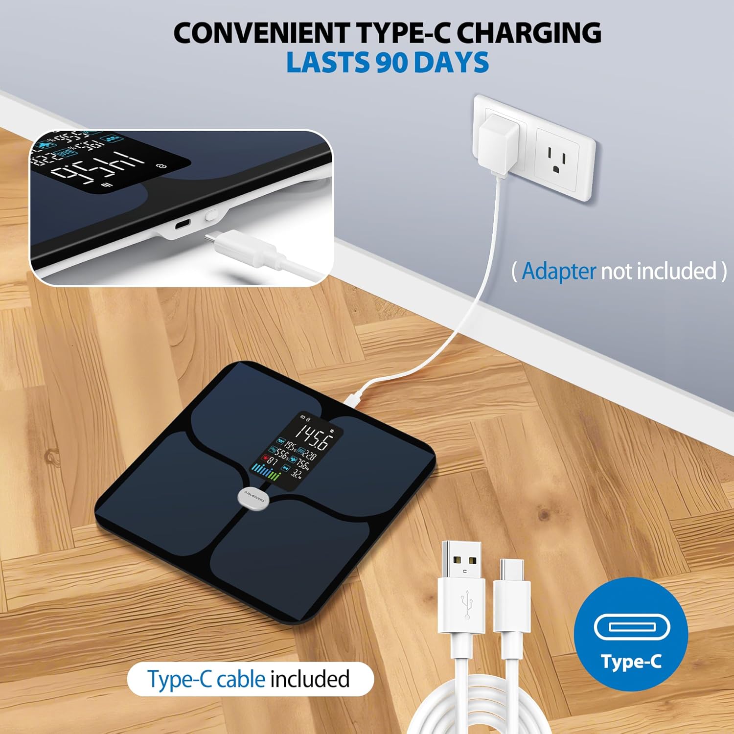 ULTRA-CLEAR DATA VISUALIZATION: Unlike standard scales that hide your data in an app, our model features a vibrant, Extra-Large Color Display Screen. View your 8 most critical measurements—including Weight, Body Fat %, and Body Type—at a glance without needing your phone. The display is easy to read in any light, giving you instant feedback the moment you step on.
