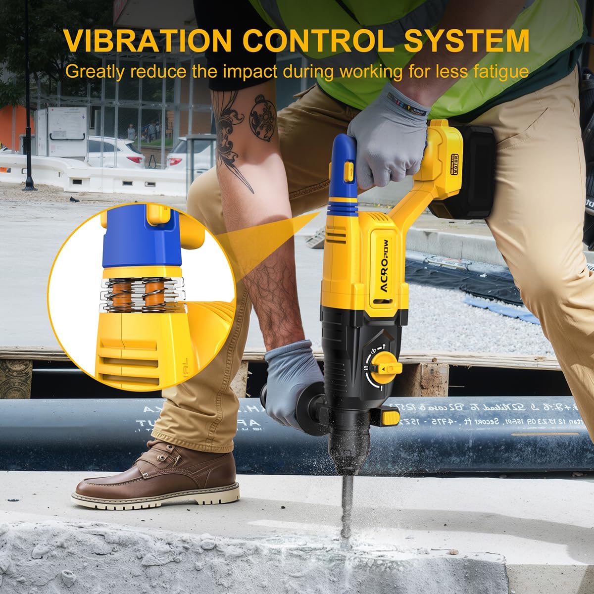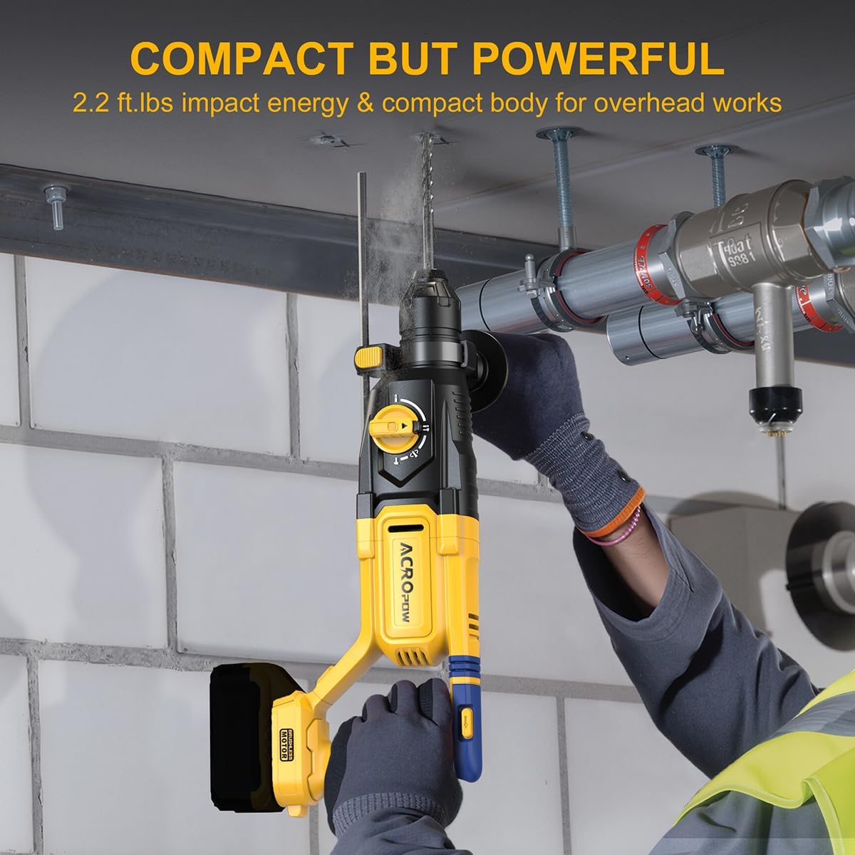 Take on the toughest construction jobs with the ACROPOW SDS-Plus Cordless Rotary Hammer Drill, engineered for professionals and dedicated DIYers who demand power, precision, and reliability. Featuring a powerful brushless motor that delivers up to 3 Joules (2.2 ft/lbs) of impact energy, this 4-function hammer drill handles concrete, masonry, wood, and metal with effortless efficiency. The brushless technology not only maximizes power output but also extends motor life while reducing maintenance requirements. The integrated safety clutch protects against wrist strain during continuous use. Choose from four operational modes: hammer only for breaking through tough materials, drill only for precision boring, hammer-drill for combined impact and rotation, and chisel adjustment for versatile anchoring work. The variable speed trigger lets you match RPM to material density, while forward/reverse functionality makes bit changes and screw driving remarkably easy. Work comfortably in any position with the 360° rotatable D-handle that adapts to your preferred angle. The advanced vibration control system significantly reduces user fatigue during extended use, and the built-in LED work light illuminates dark workspaces. This comprehensive kit includes four SDS-Plus drill bits (6mm, 8mm, 10mm, 12mm, 14mm), a depth gauge, and a durable carrying case for easy transport. Compatible with DEWALT 20V Max batteries including DCB200, DCB203, DCB204, DCB205, and DCB206 (battery and charger sold separately).