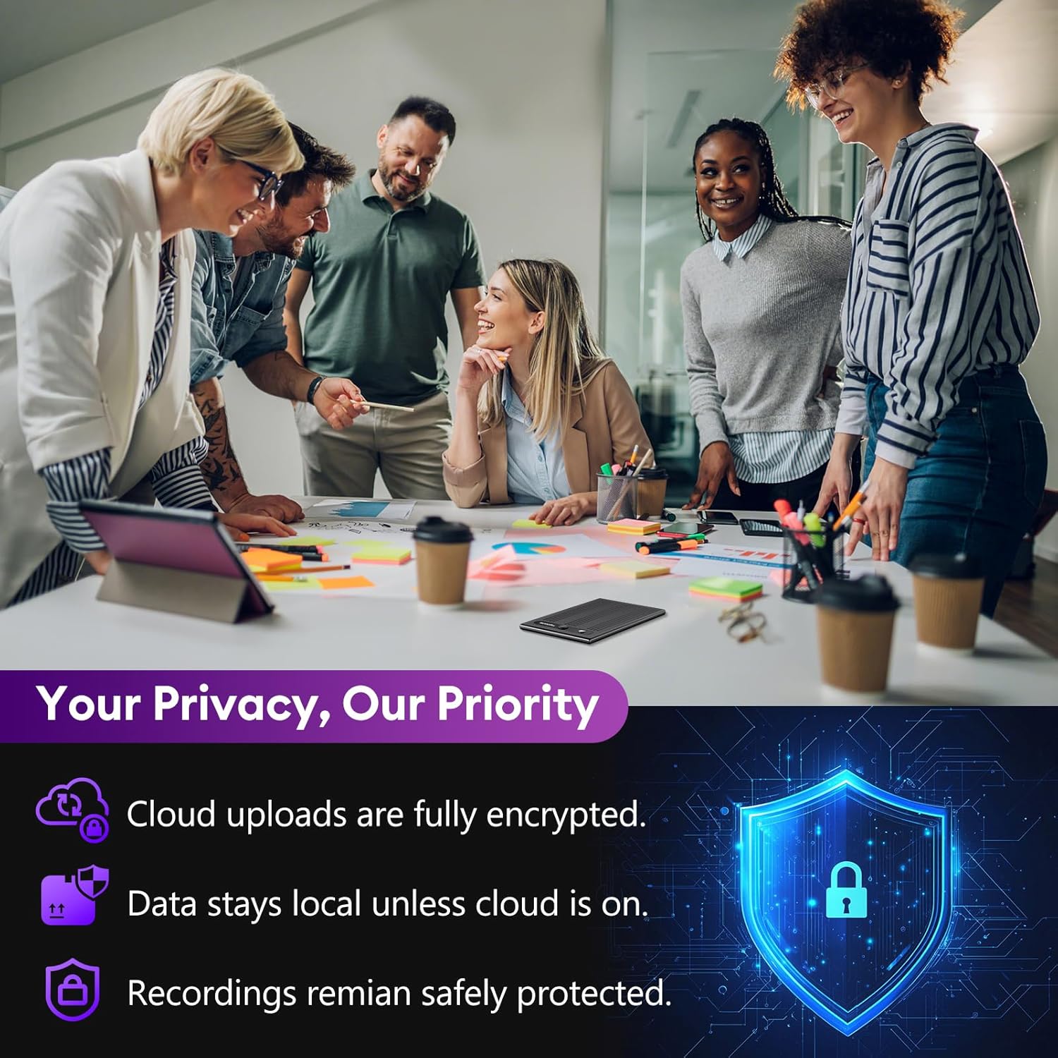 Your data security is paramount. This recorder features military-grade hardware encryption that encrypts your audio locally before it is ever processed or uploaded, ensuring your sensitive conversations remain private. With 64GB of built-in memory, you have ample space to store thousands of hours of high-quality audio without the need for additional SD cards.