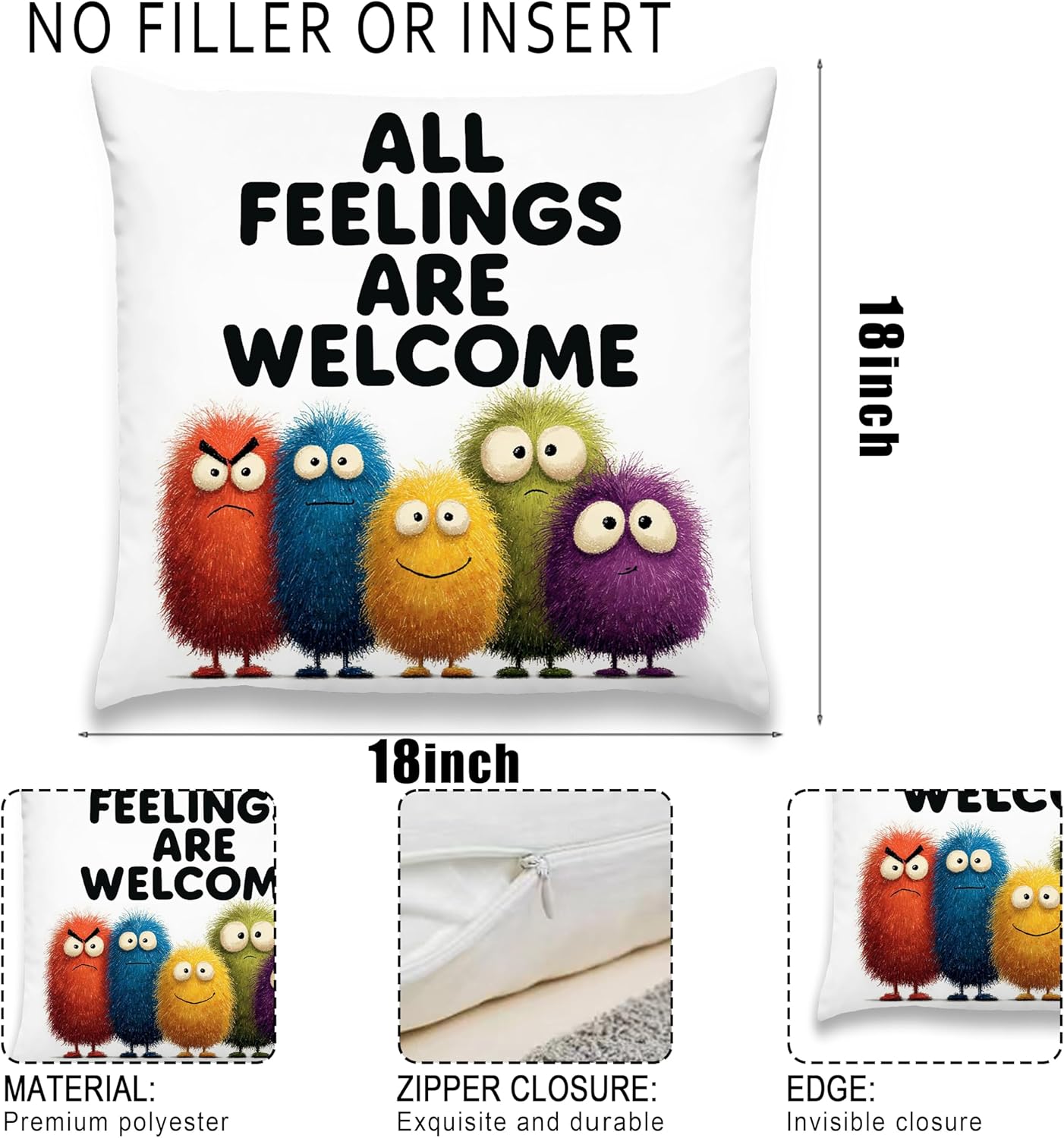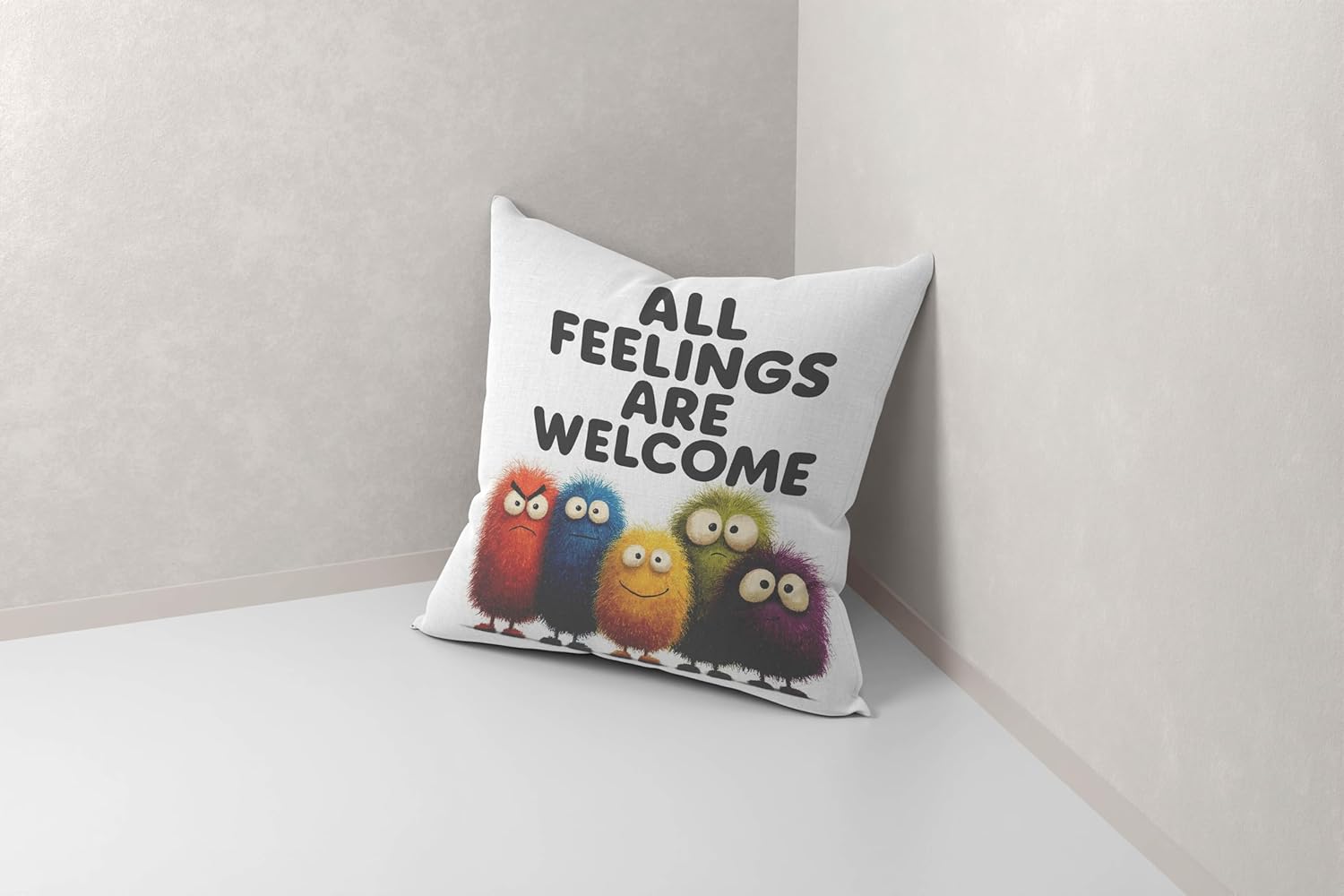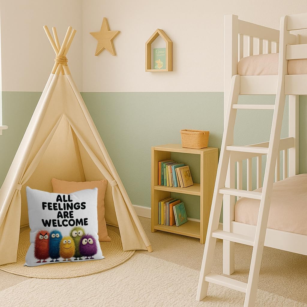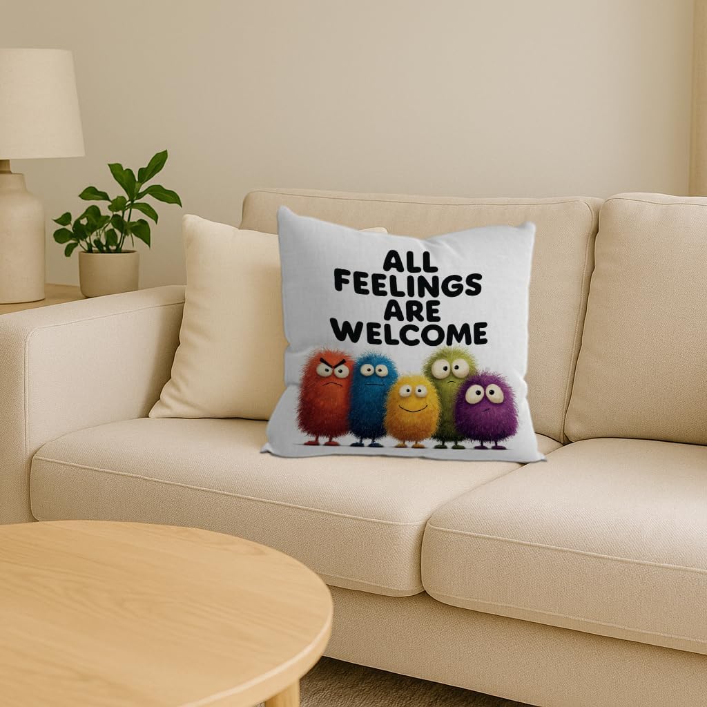 Add a touch of whimsical comfort to any space with our charming monster-themed throw pillow cover! Crafted from ultra-soft flannel fabric, this delightful pillowcase features a heartwarming ‘All Feelings Welcome’ design that encourages emotional expression and creates a supportive environment for kids and teens. Perfect for bedrooms, playrooms, classrooms, or living room sofas, this decorative cover transforms any plain pillow into a cozy companion. The playful monster characters bring joy and laughter while promoting positive messages about accepting all emotions. Made with premium quality materials for durability and easy care – simply machine wash for convenient cleaning. This thoughtful gift is ideal for housewarmings, birthdays, back-to-school, or any special occasion. Measures 18 x 18 inches. NOTE: Pillow insert not included.