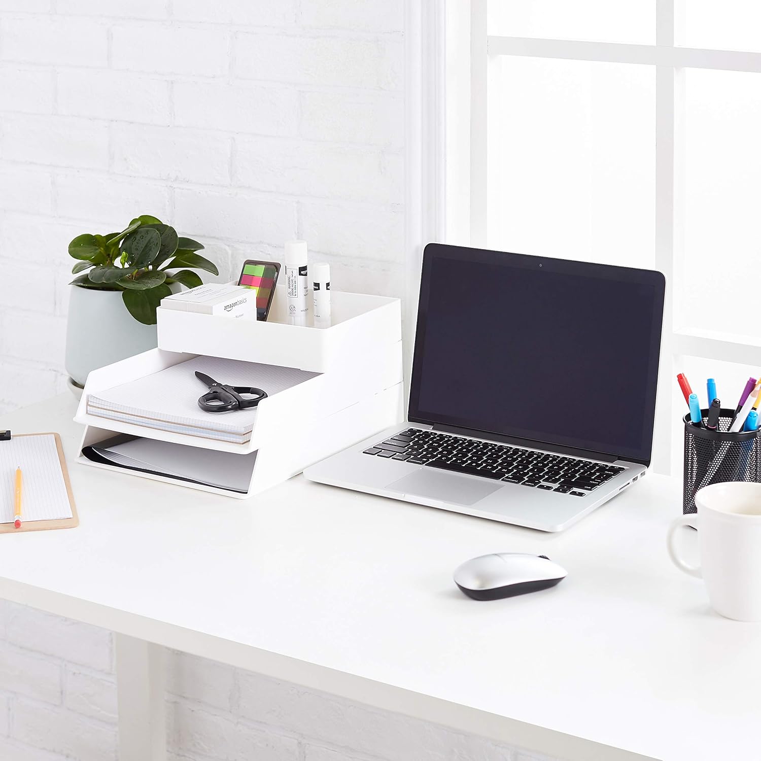 Declutter your workspace and boost productivity with the Amazon Basics Rectangular Plastic Desk Organizer Bundle. This comprehensive 3-piece set provides a stylish and efficient storage solution for your home office, classroom, or corporate desk. The bundle includes two stackable letter trays designed to manage documents, files, and mail, keeping your desktop flat and accessible. Complementing the trays is a versatile accessory organizer featuring multiple compartments, perfect for storing pens, pencils, highlighters, scissors, paper clips, and other essential supplies. Crafted from durable, high-quality plastic with a clean white finish, this organizer resists wear and tear while blending seamlessly with any décor. The stackable design allows you to customize your setup, maximizing vertical space to keep your workspace tidy and organized. Whether you are sorting invoices or stashing stationery, this Amazon Basics bundle delivers reliability and function in one simple package.