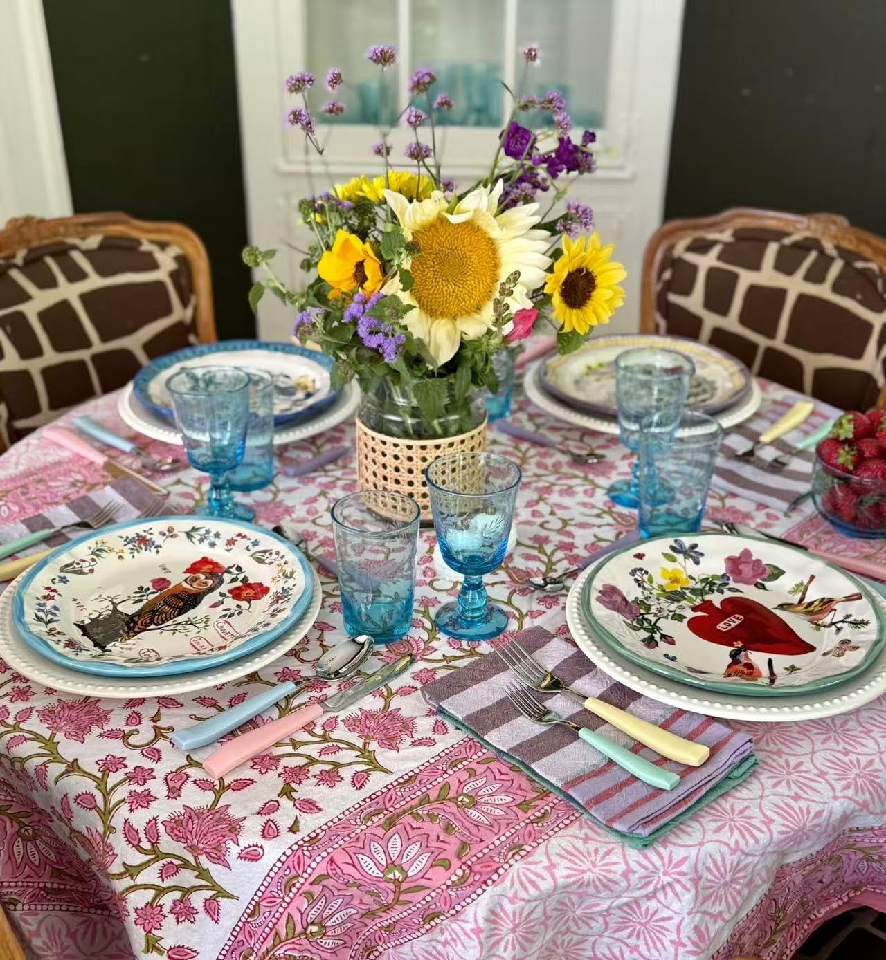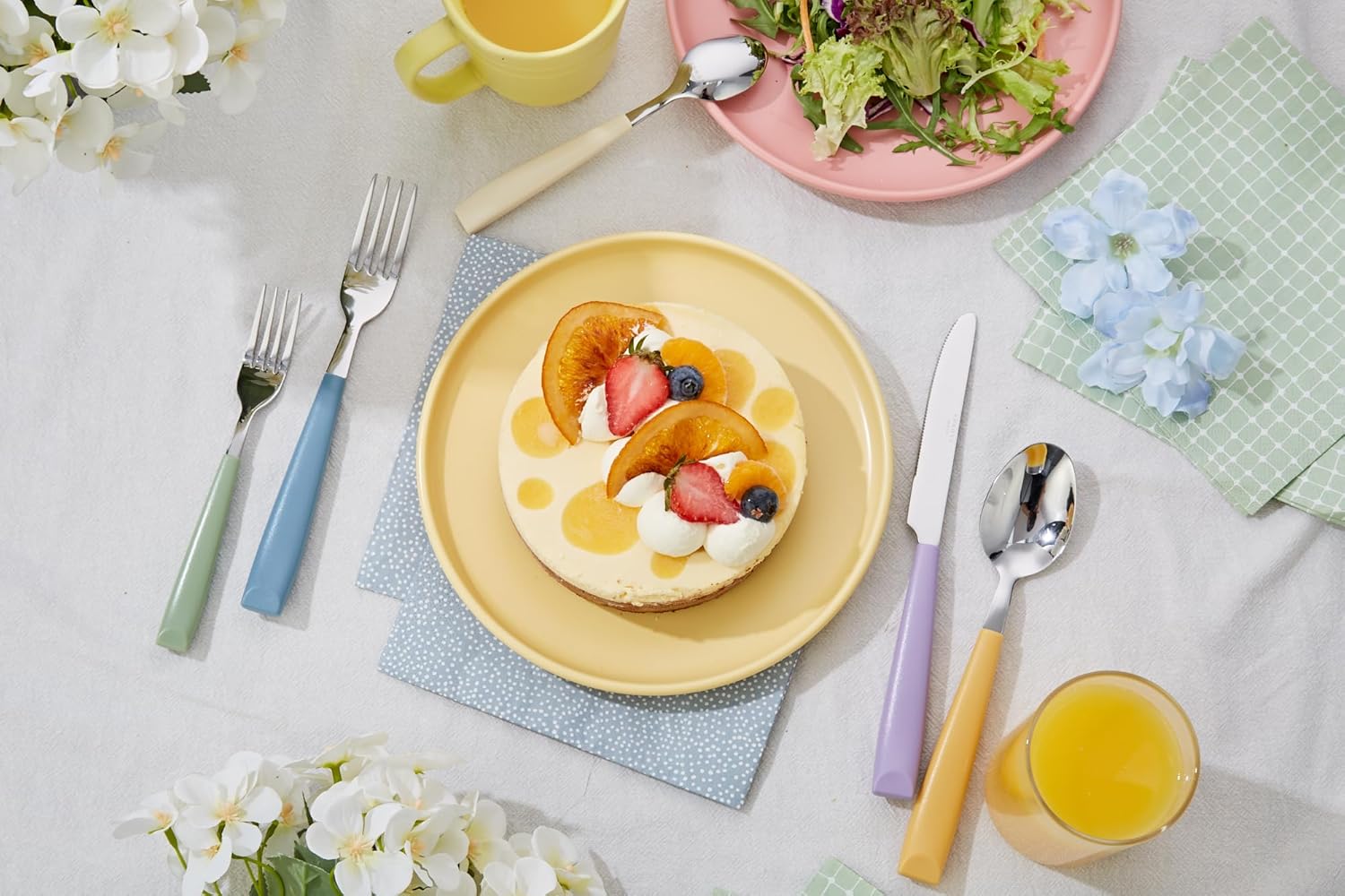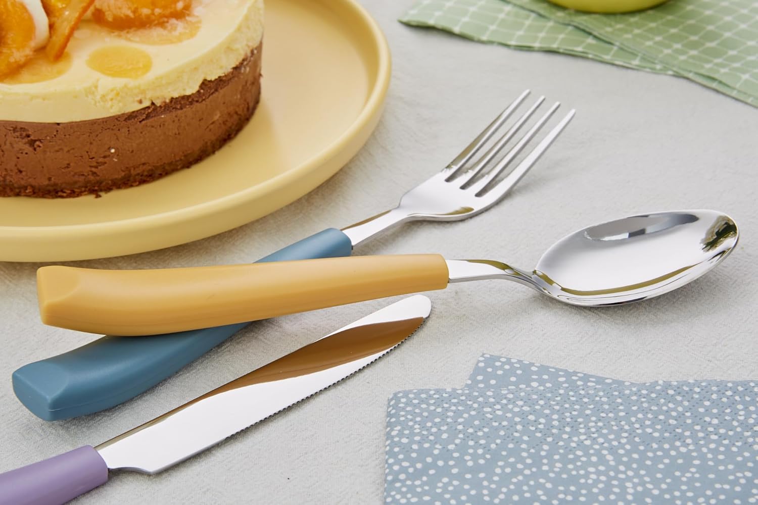 20-piece stainless steel flatware set for 4 settings. Includes dinner forks, salad forks, knives, spoons & dessert spoons. Colorful handles, mirror polish, dishwasher safe.