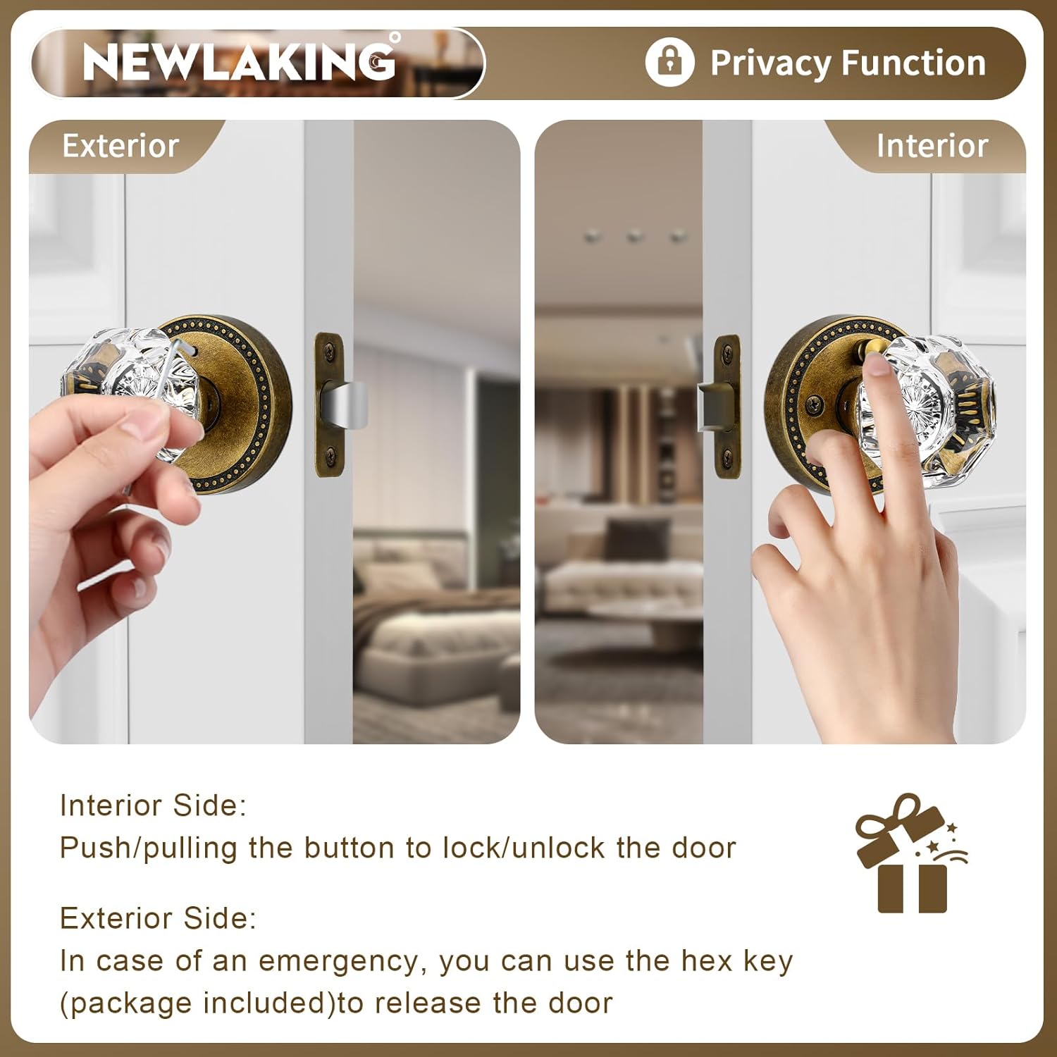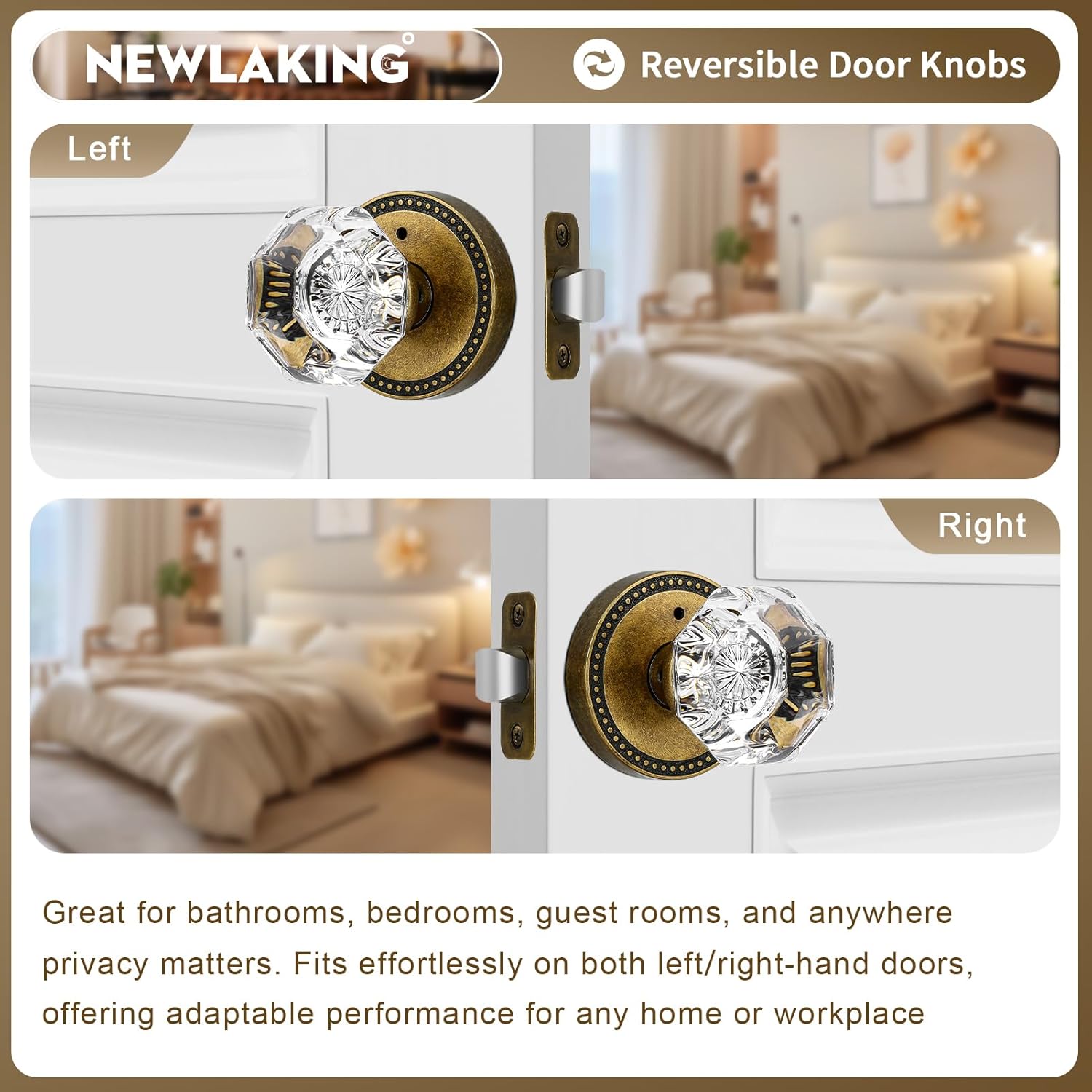 Elevate your interior doors with this stunning antique brass bronze door knob featuring a elegant crystal glass center. Designed specifically for bedrooms and bathrooms, this privacy lock knob provides the perfect blend of vintage charm and modern functionality. The smooth-operating lock mechanism ensures your personal space remains protected, while the external emergency release hole allows for quick access when needed. Crafted with a durable zinc alloy core and finished in a distressed antique brass, these door handles complement both retro and contemporary home decors beautifully. The distinctive octagonal design with dotted-circle panel adds a touch of old-world elegance to any room. Installation is straightforward with the adjustable latch fitting doors 1-3/8 inch to 1-3/4 inch thick, compatible with both left and right-handed doors. The latch adjusts between 2-3/8 inch and 2-3/4 inch to fit standard door preparations. Each set includes all necessary mounting hardware and detailed instructions for easy DIY installation.