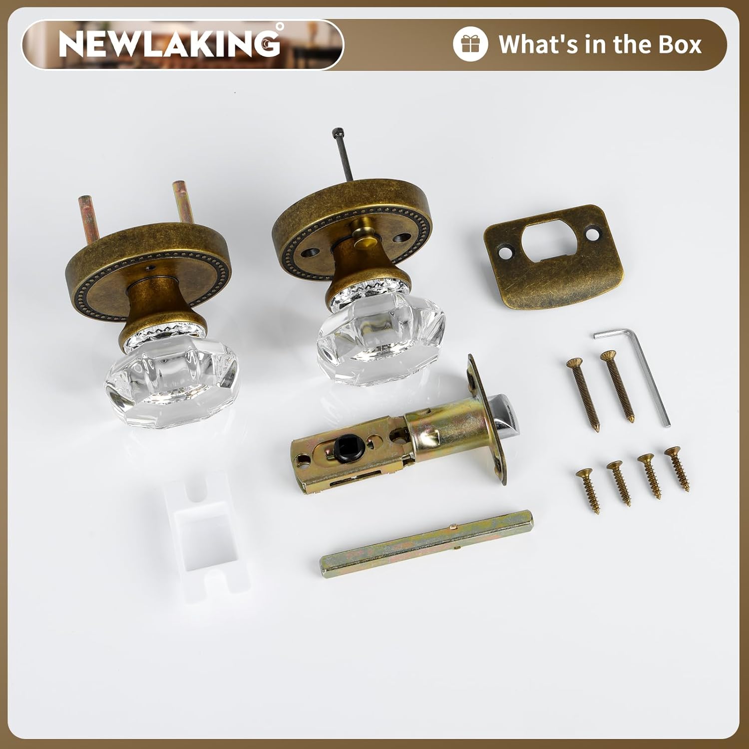 Antique Brass Privacy Door Knobs – Crystal Glass Interior Lock Set for Bedroom/Bathroom, Retro Octagon Style, 1-Pack