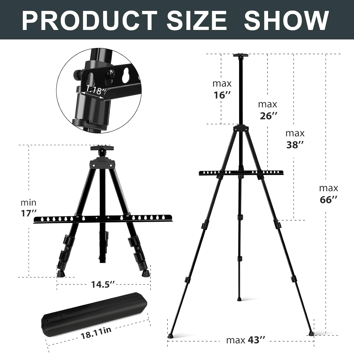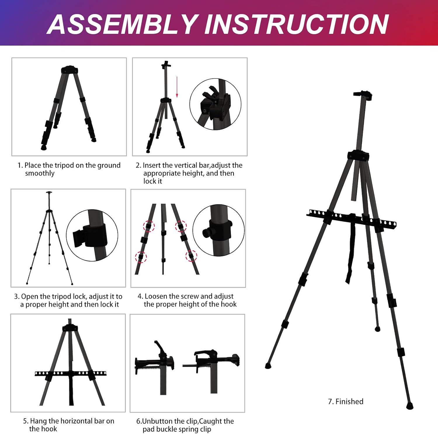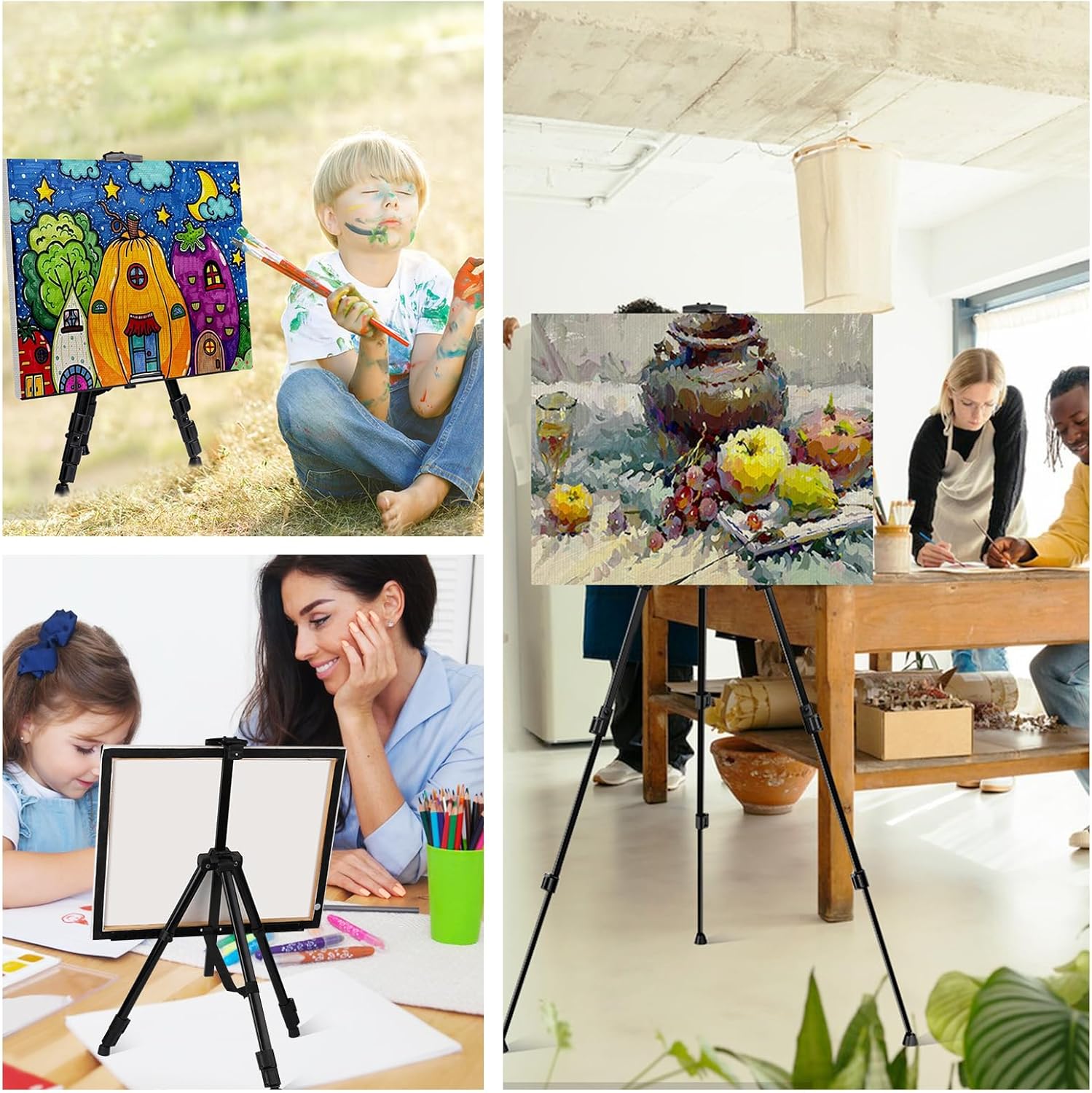 Elevate your artistic creations and displays with the AROIC 8-Pack Adjustable Painting Easels. Designed for versatility and durability, these metal tripod easels are perfect for artists of all levels, classrooms, galleries, and events. The adjustable height mechanism allows you to transition seamlessly between a 17-inch tabletop setup and a 66-inch floor stand, accommodating a wide range of canvas sizes and mediums. Crafted from lightweight yet sturdy aluminum, these easels are built to last while remaining portable for outdoor painting or travel. Each easel features a convenient spring-loaded clip on top to secure your canvas in place, preventing slips and ensuring stability while you work. The non-slip rubber feet provide extra grip on uneven surfaces, making them ideal for use indoors or outdoors. Assembly is effortless with the included instructions, and when you’re done, the easels fold down compactly. This value set includes 8 individual easels and 8 matching storage bags, offering a complete storage and transport solution. Whether you are displaying artwork, hosting a wedding sign-in board, or teaching an art class, this bulk set delivers professional quality at an unbeatable value.