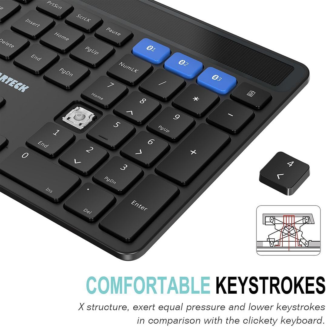 Experience the ultimate typing freedom with the Arteck Solar Bluetooth Keyboard. Designed for seamless multi-device productivity, this full-size keyboard eliminates the need for constant battery replacements thanks to its advanced solar-charging technology.