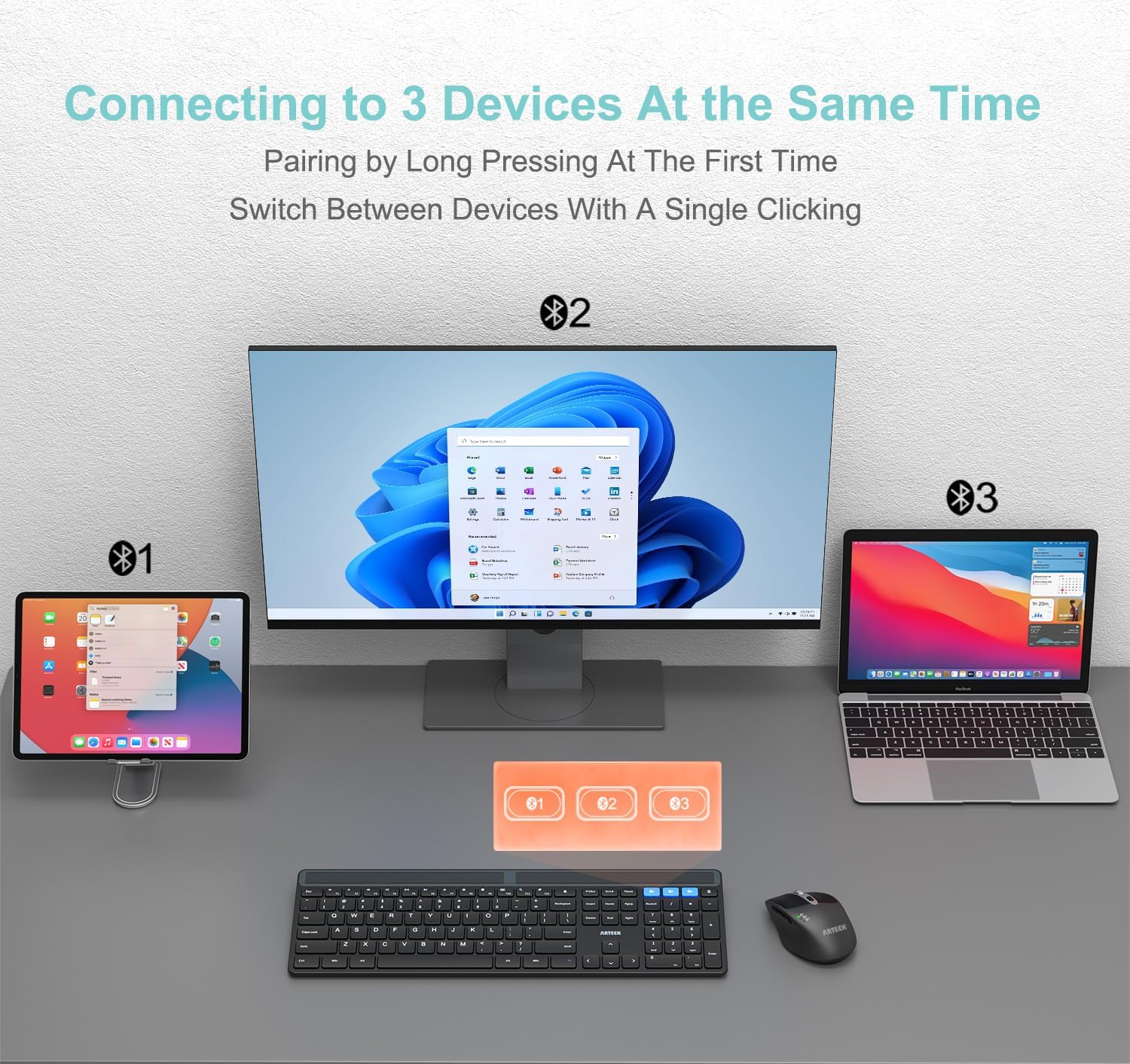 Boost your productivity by connecting up to three Bluetooth devices simultaneously. With a simple click, switch between your desktop computer, laptop, tablet, and smartphone without the need for re-pairing. Please note: This keyboard connects via Bluetooth and requires a Bluetooth-enabled host device (USB dongle not included).