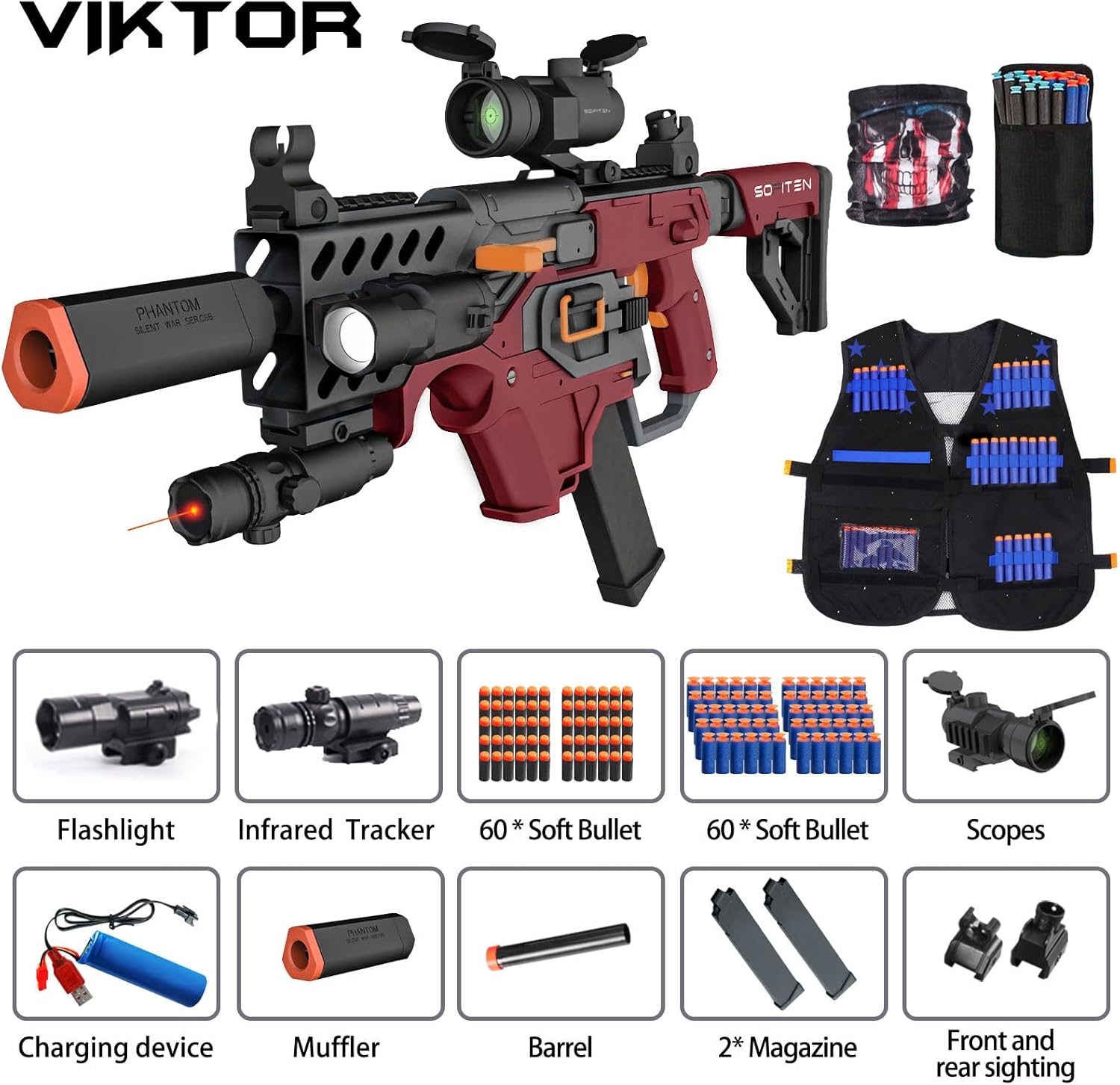 Package Includes: 1x Automatic Blaster, 1x Tactical Vest, 1x Rechargeable Battery & USB Cable, 1x Infrared Sight, 1x Flashlight, 1x Scope, 1x Magazine, 60x Darts, 60x Shells, and tactical barrel attachments.