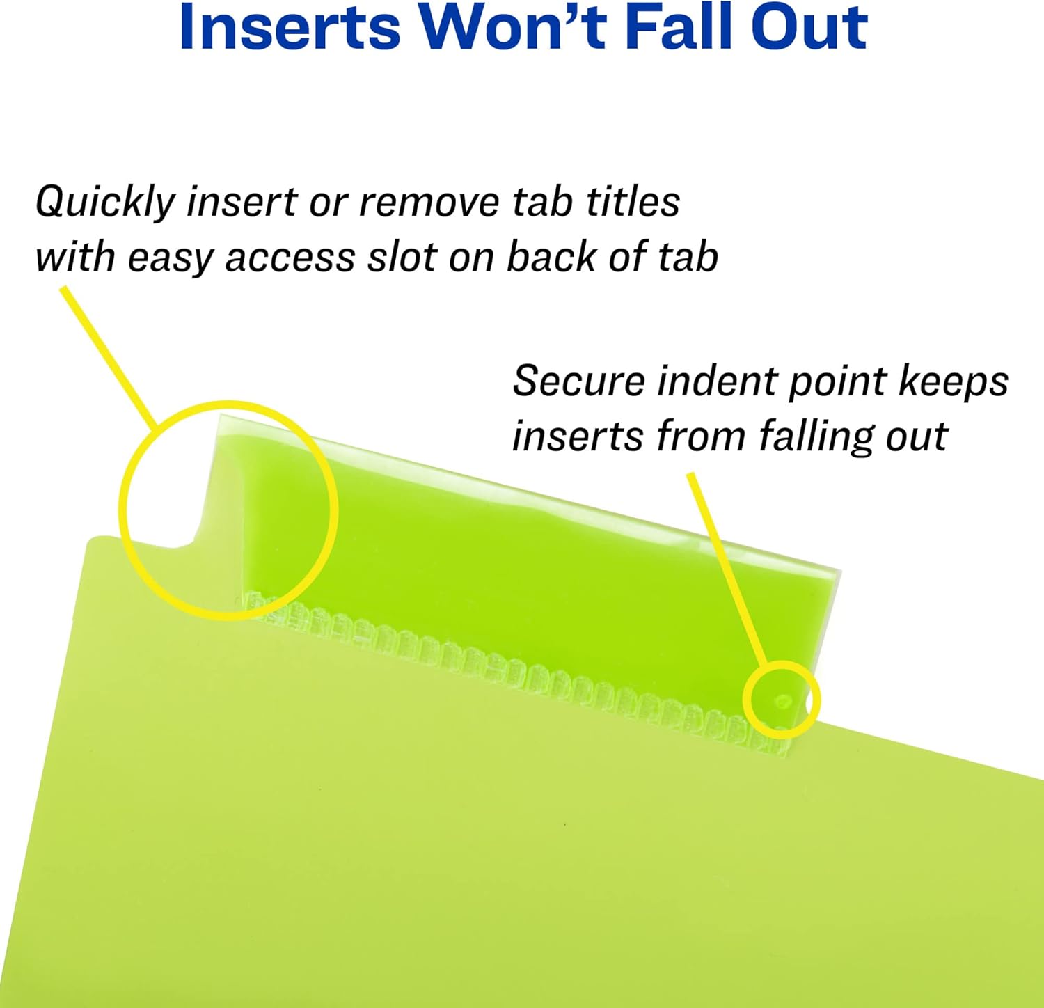 Organization is seamless with the unique insertable tab system. The easy-access slot allows you to slide your labels in and out quickly, while the innovative indented point locks the insert firmly in place to prevent it from slipping out. Each set includes printable tab inserts compatible with laser and inkjet printers, or you can simply write on them with pens, pencils, or permanent markers.