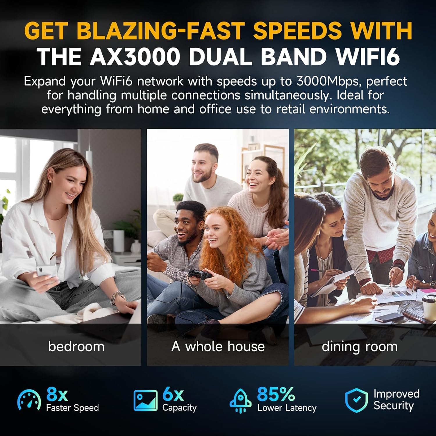 Upgrade your internet experience with the next-gen AX3000 Mesh WiFi Extender. Utilizing the latest WiFi 6 technology, this booster delivers blazing-fast speeds of up to 3000Mbps, making it 10x faster than standard WiFi 5 extenders. Whether you are streaming 8K movies, engaging in competitive gaming, or video conferencing, enjoy lag-free, low-latency performance throughout your home.