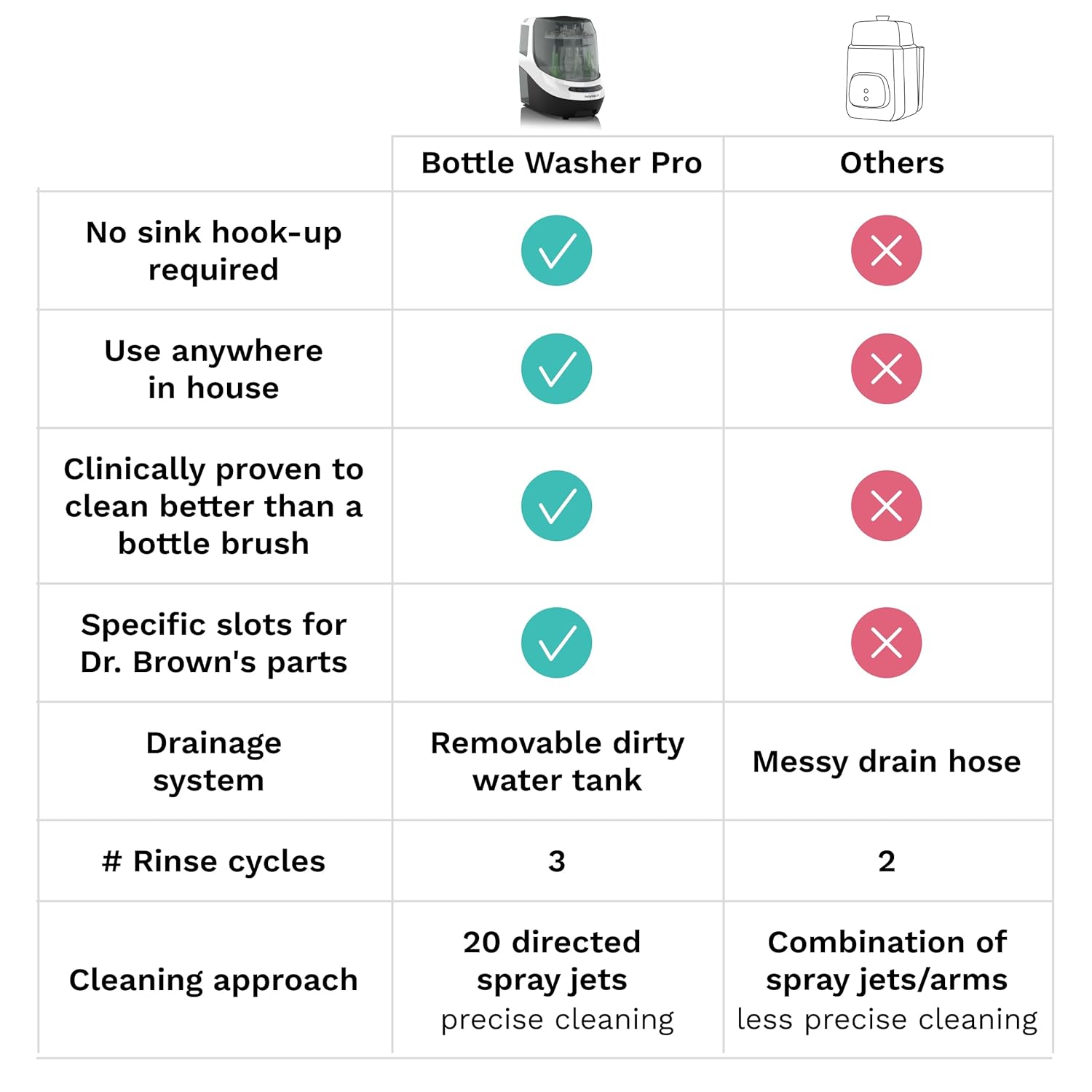 • Clinically Proven Clean: Utilizes 20 high-pressure spray jets to powerfully wash away milk residue, ensuring bottles, pump parts, and sippy cups are cleaned inside and out. It cycles through 3 rinse stages to remove 100% of soap residue.