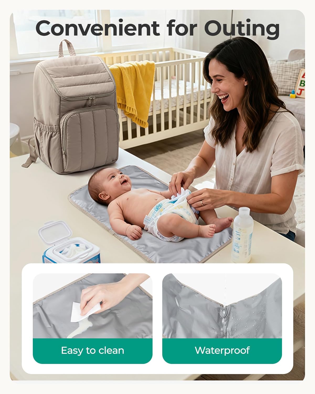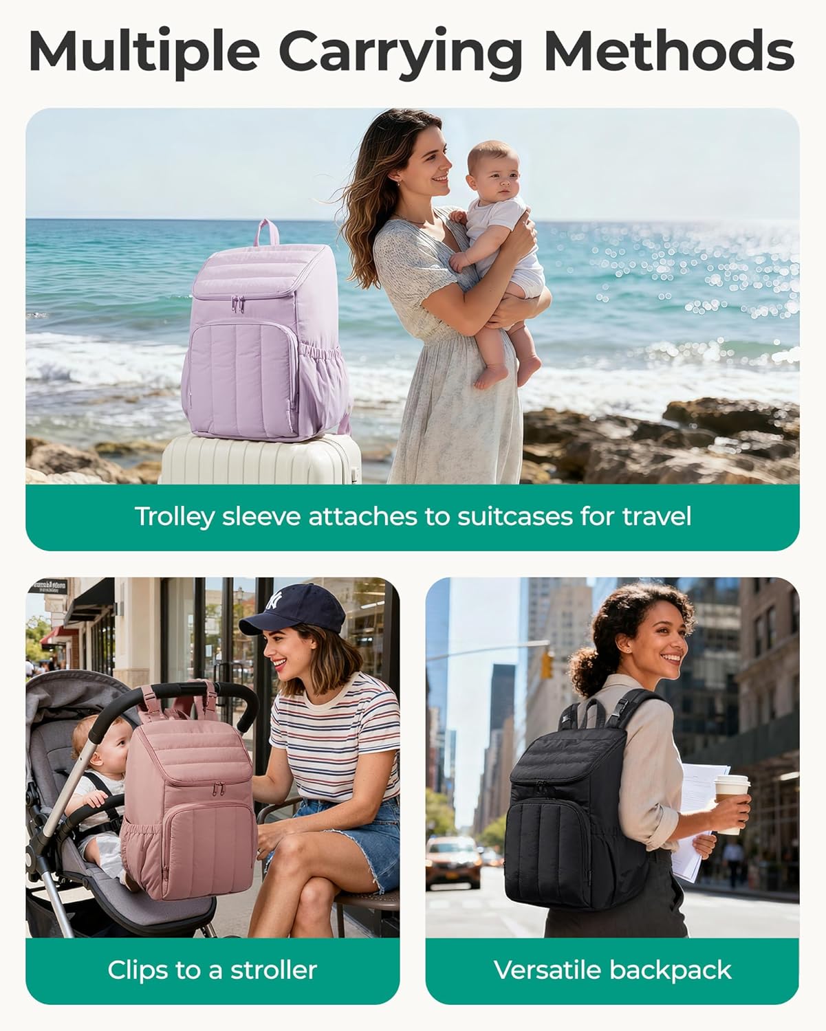 • Travel Ready: Includes stroller straps, luggage handle attachment, and a portable changing pad.