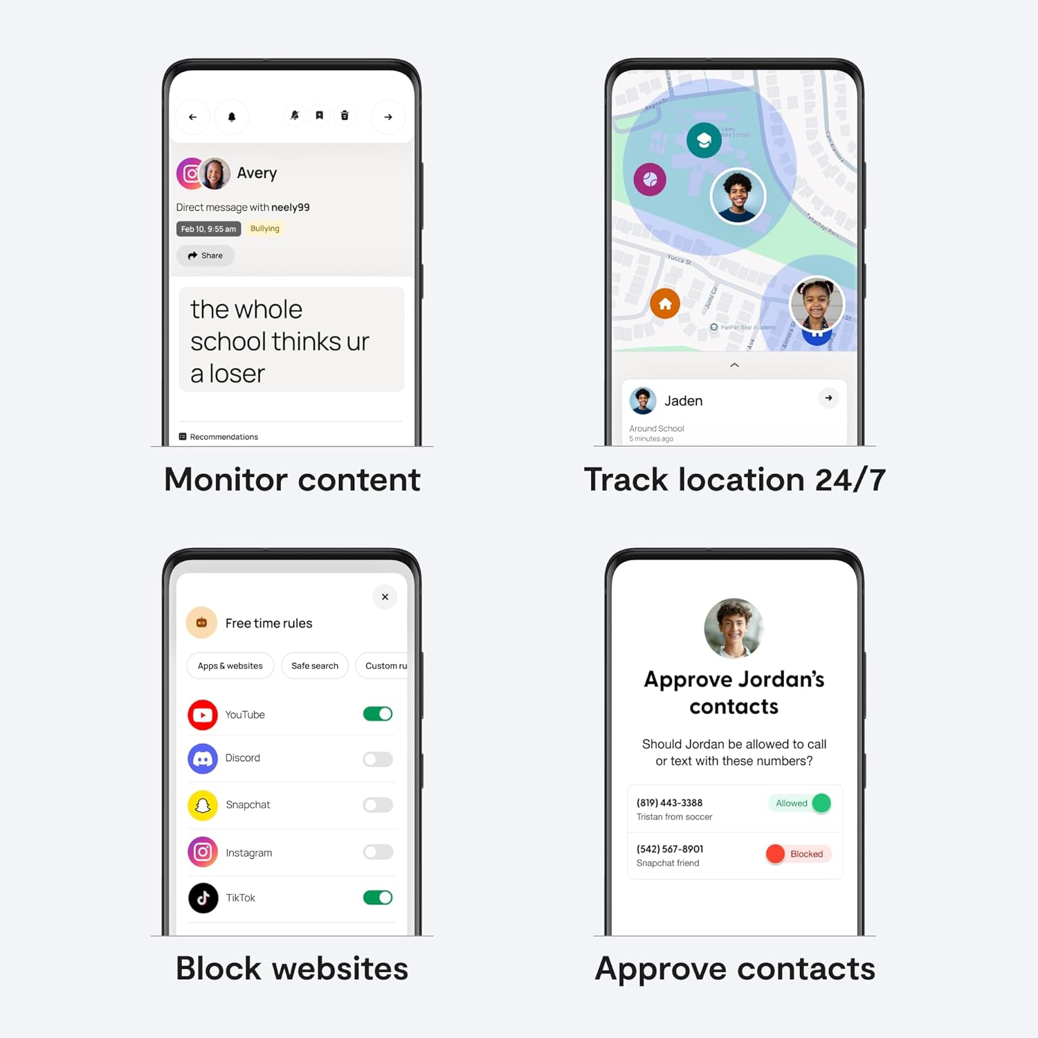 • MANAGE ACCESS: Screen incoming contacts and approve specific apps before your child can download them.