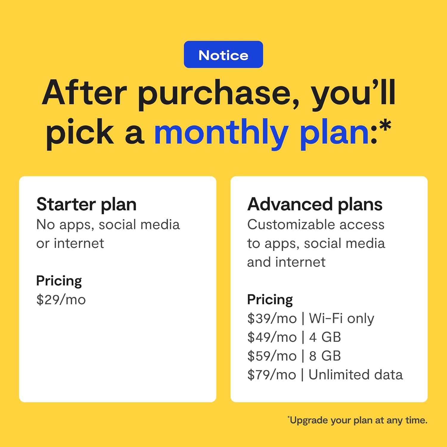• DATA PLANS: Flexible monthly plans required upon activation (Starter, Wi-Fi, 4GB, 8GB, and Unlimited options).