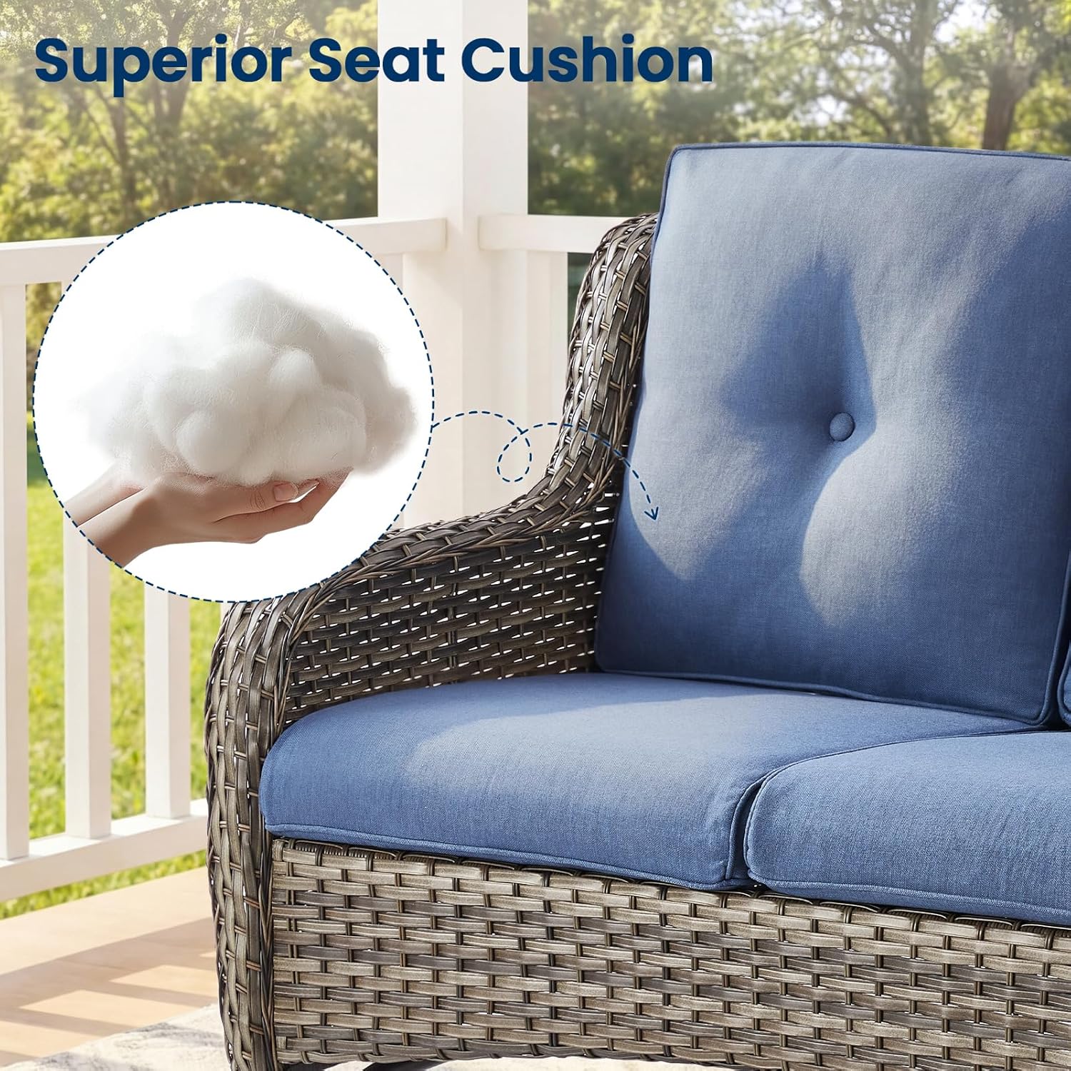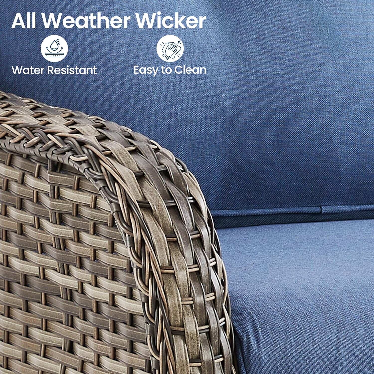 - LUXURIOUS THICK CUSHIONS: Includes high-density foam seat cushions and soft polyester back cushions covered in water-resistant, all-weather Olefin fabric (Grey Wicker/Blue Cushion).