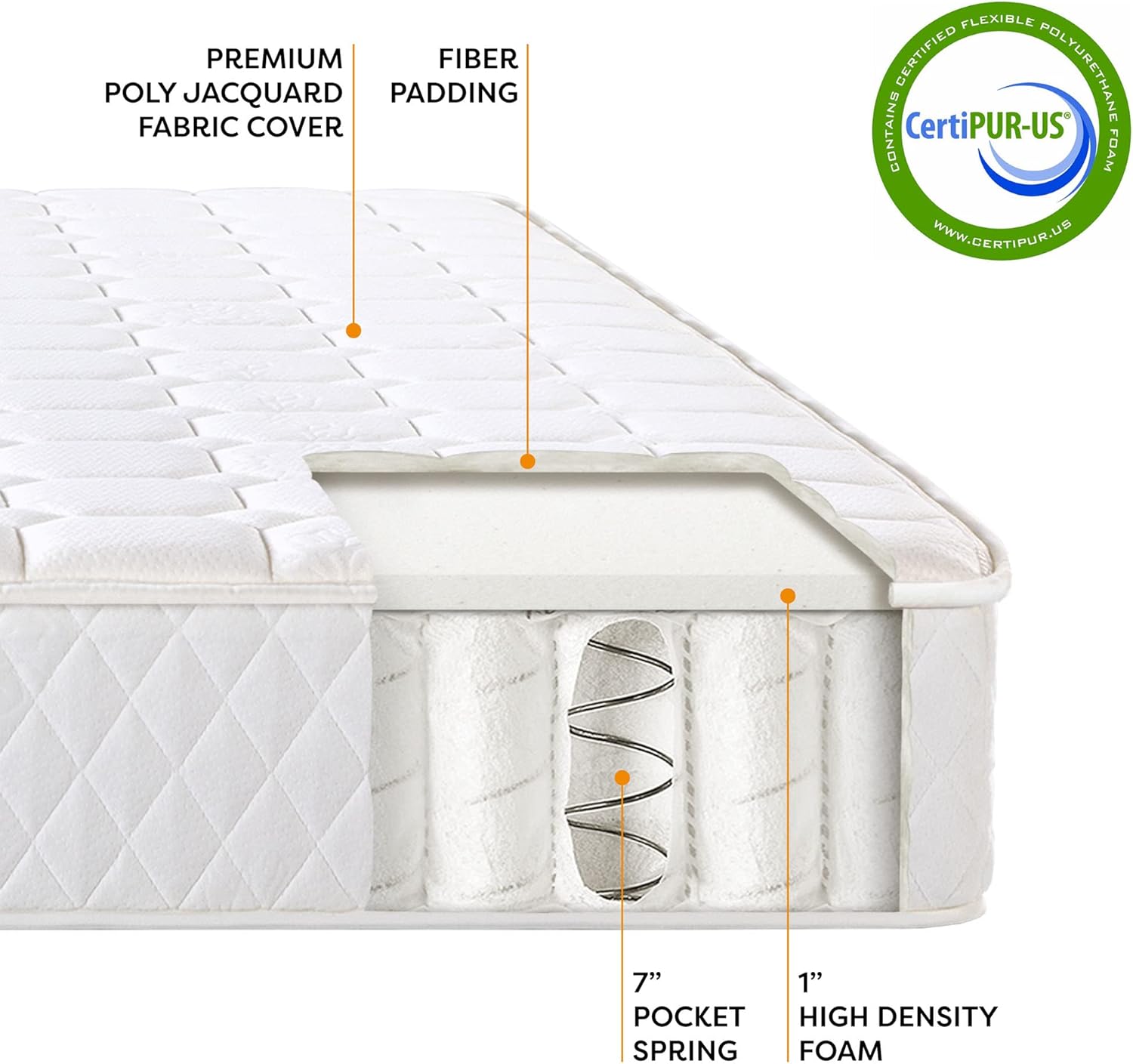 - OPTIMAL SUPPORT: 8-inch profile features individually encased pocket springs for superior back support and reduced motion transfer.