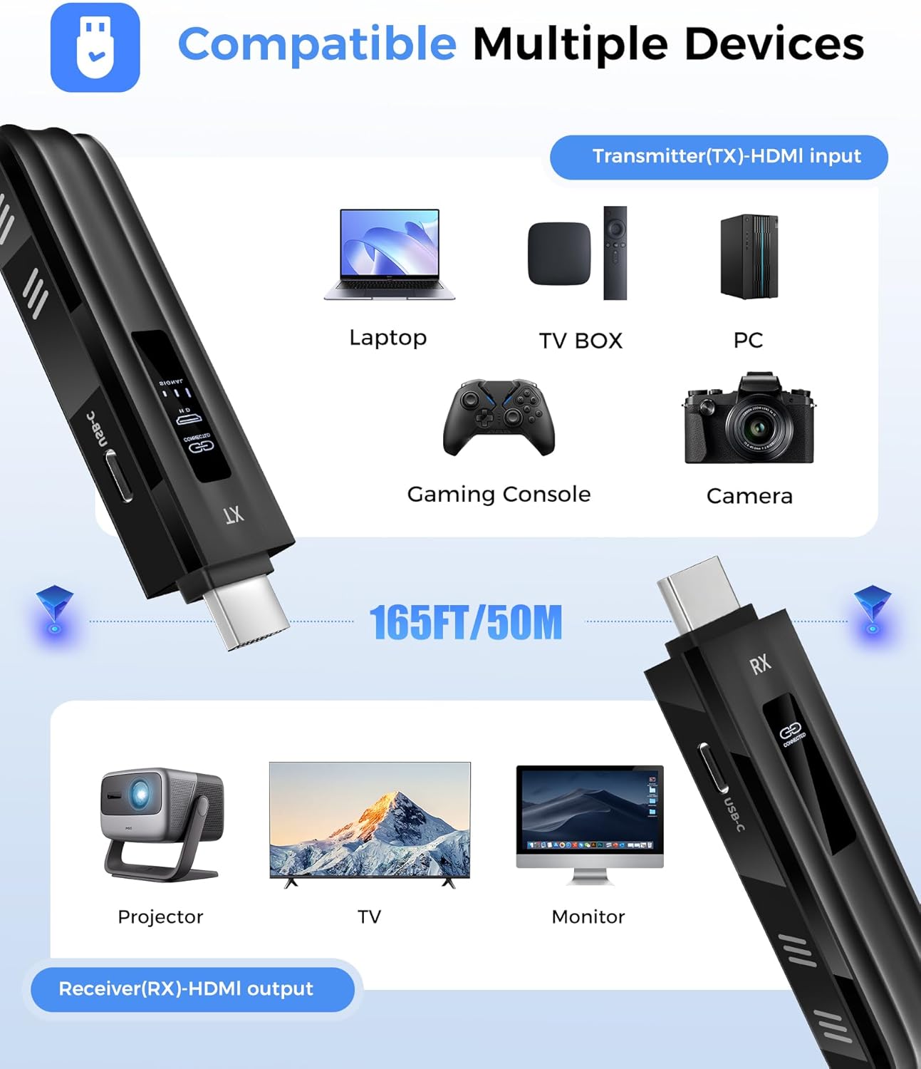 • Universal Compatibility: Connect everything from PCs and MacBooks to Samsung S21, iPhone 15+, and iPads. The receiver works seamlessly with HDTVs, projectors, and monitors.