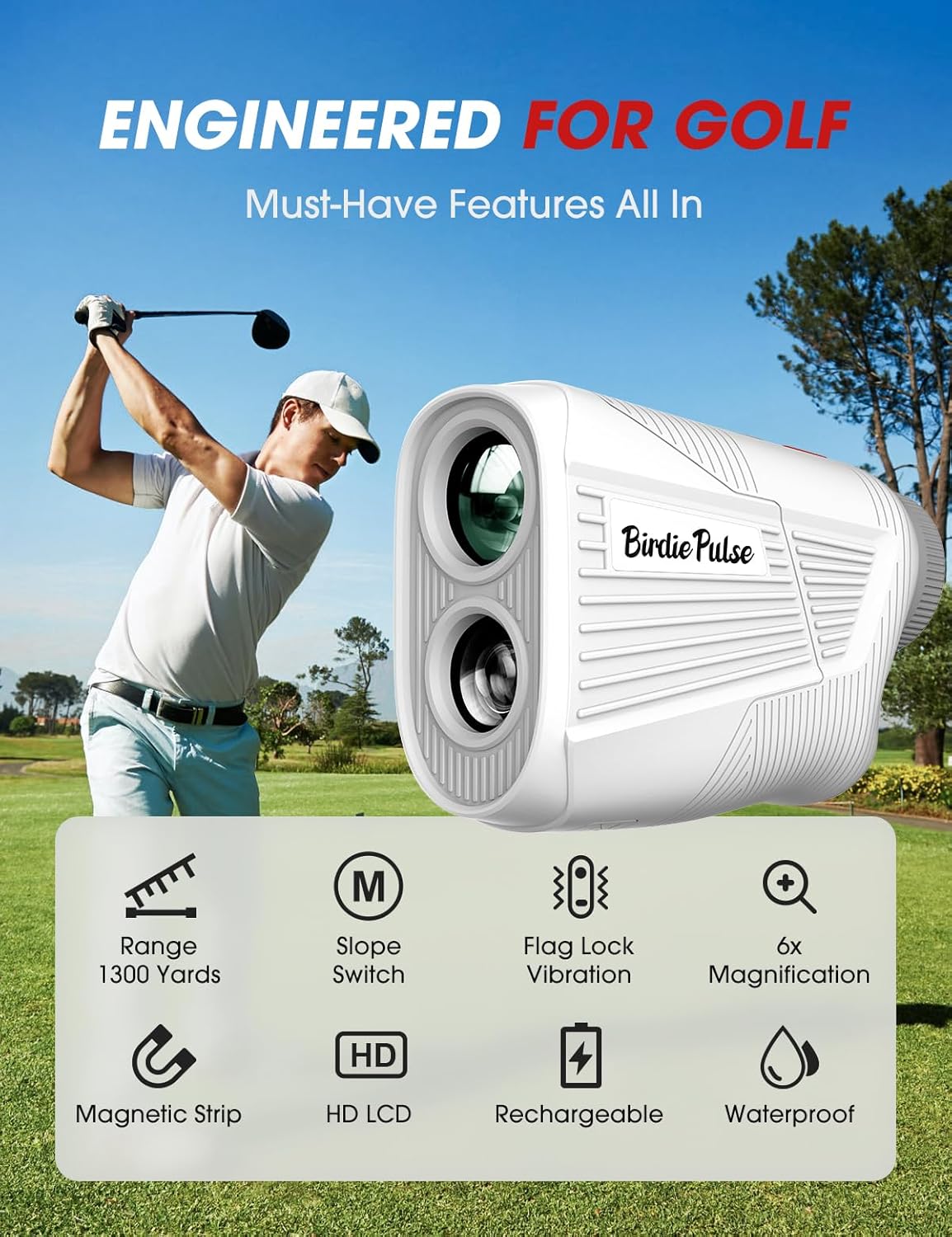 Take your golf game to the next level with the BirdiePulse 2025 Golf Rangefinder, engineered for precision and built for convenience. This advanced rangefinder features an impressive 1300-yard measuring range with ±0.5-yard accuracy, ensuring you always know the exact distance to the flag, hazards, or fairway markers. The integrated slope switch calculates elevation changes for smarter club selection, while the flag-lock vibration provides instant tactile confirmation when you’ve locked onto your target up to 300 yards away. The 6-6.5X magnification with HD LCD display delivers crystal-clear visuals in any lighting condition. Designed for on-course convenience, the built-in powerful magnet securely attaches to golf carts, club heads, or metal surfaces, keeping your rangefinder within arm’s reach at all times. The USB Type-C rechargeable battery means no more hunting for replacement batteries—just quick charging and you’re back on the course. Whether you’re a tournament player needing straight-line mode compliance or a casual golfer wanting to factor in elevation, the one-button control makes switching between modes effortless. Compact, lightweight, and ergonomically designed to fit comfortably in your hand, this rangefinder is the ultimate golfing companion.
