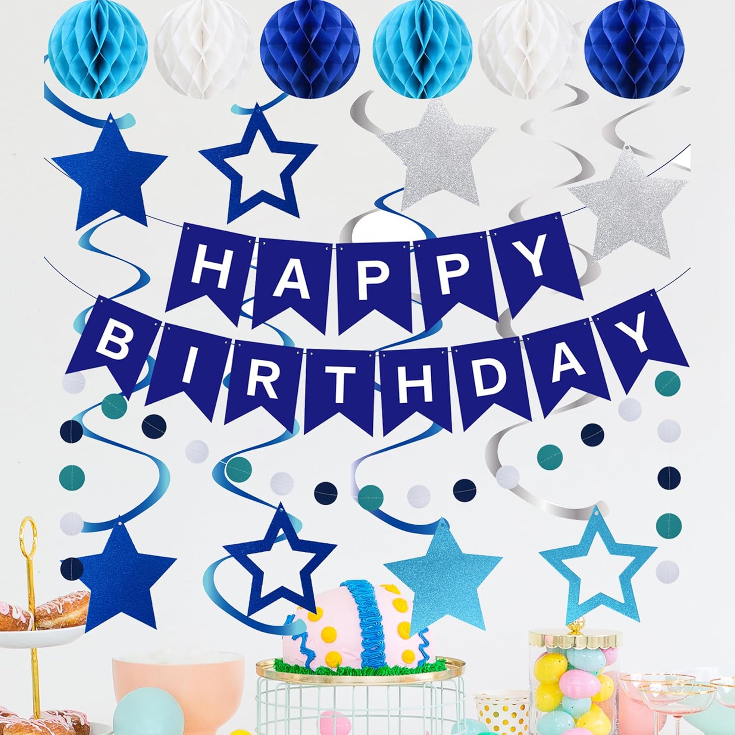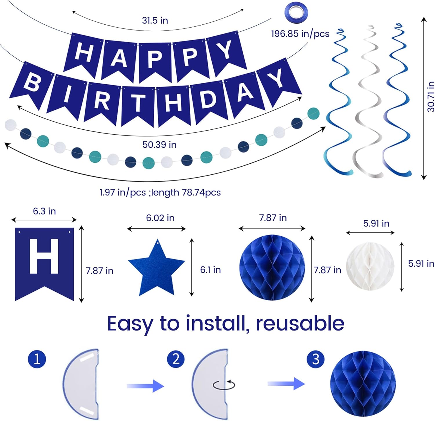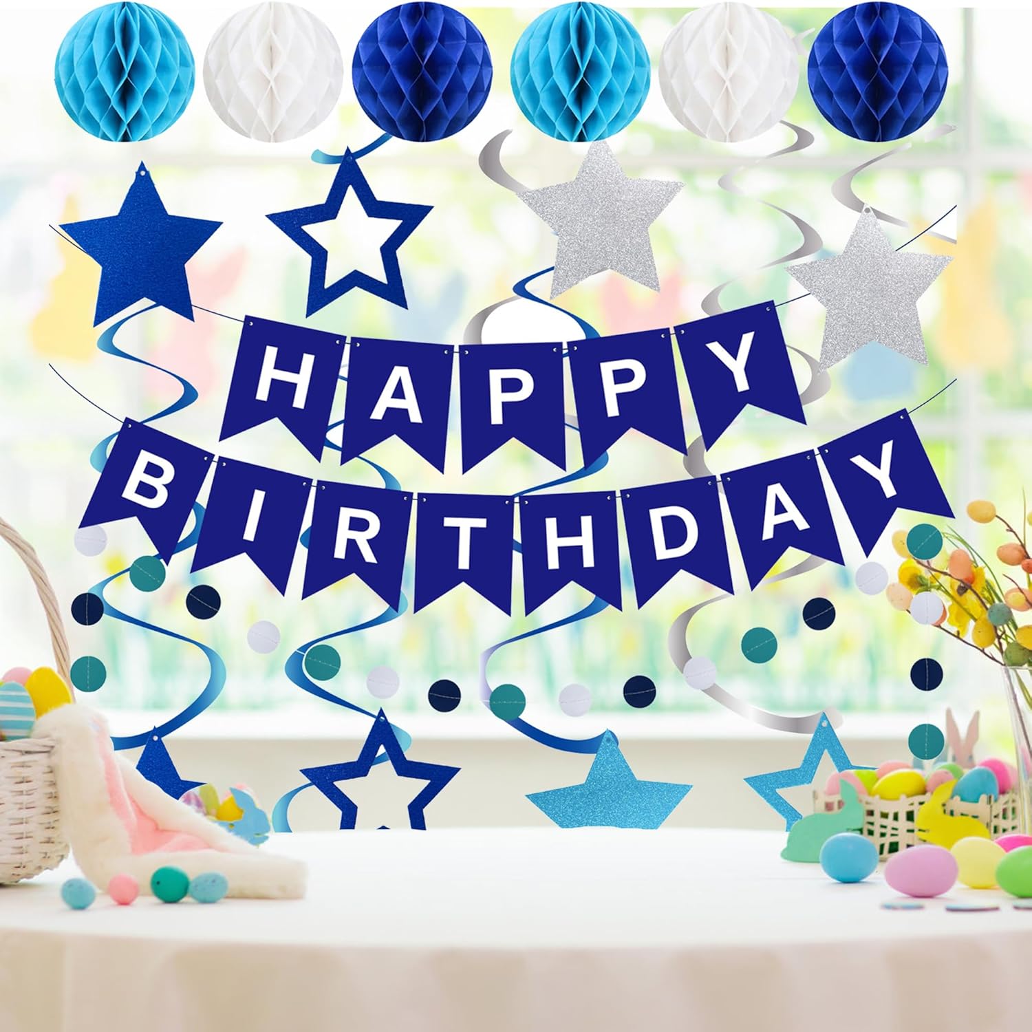 Blue Birthday Party Decorations Kit – Premium Honeycomb Balls, Swirls & Banner Set for Men, Women, Boys & Girls