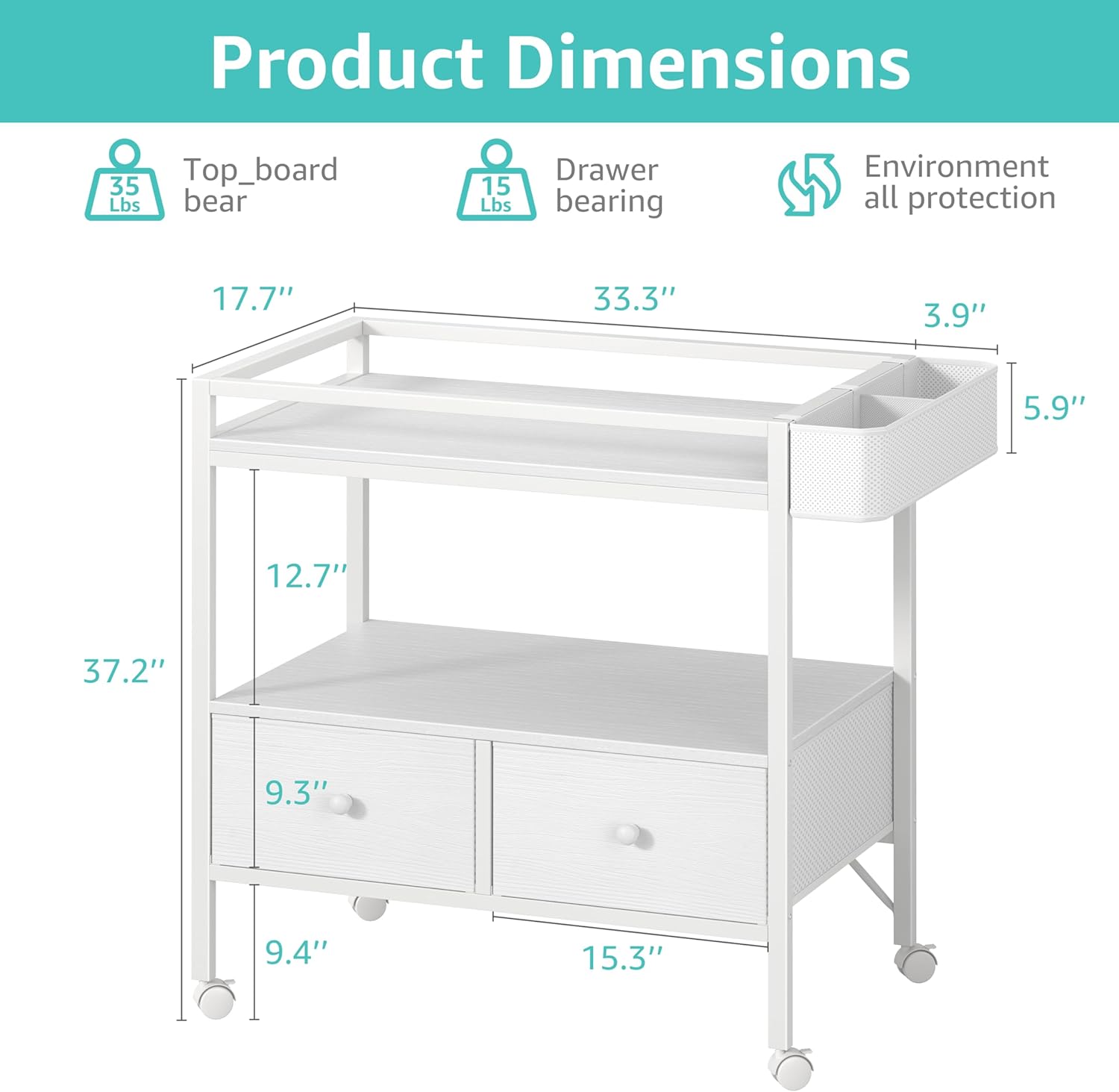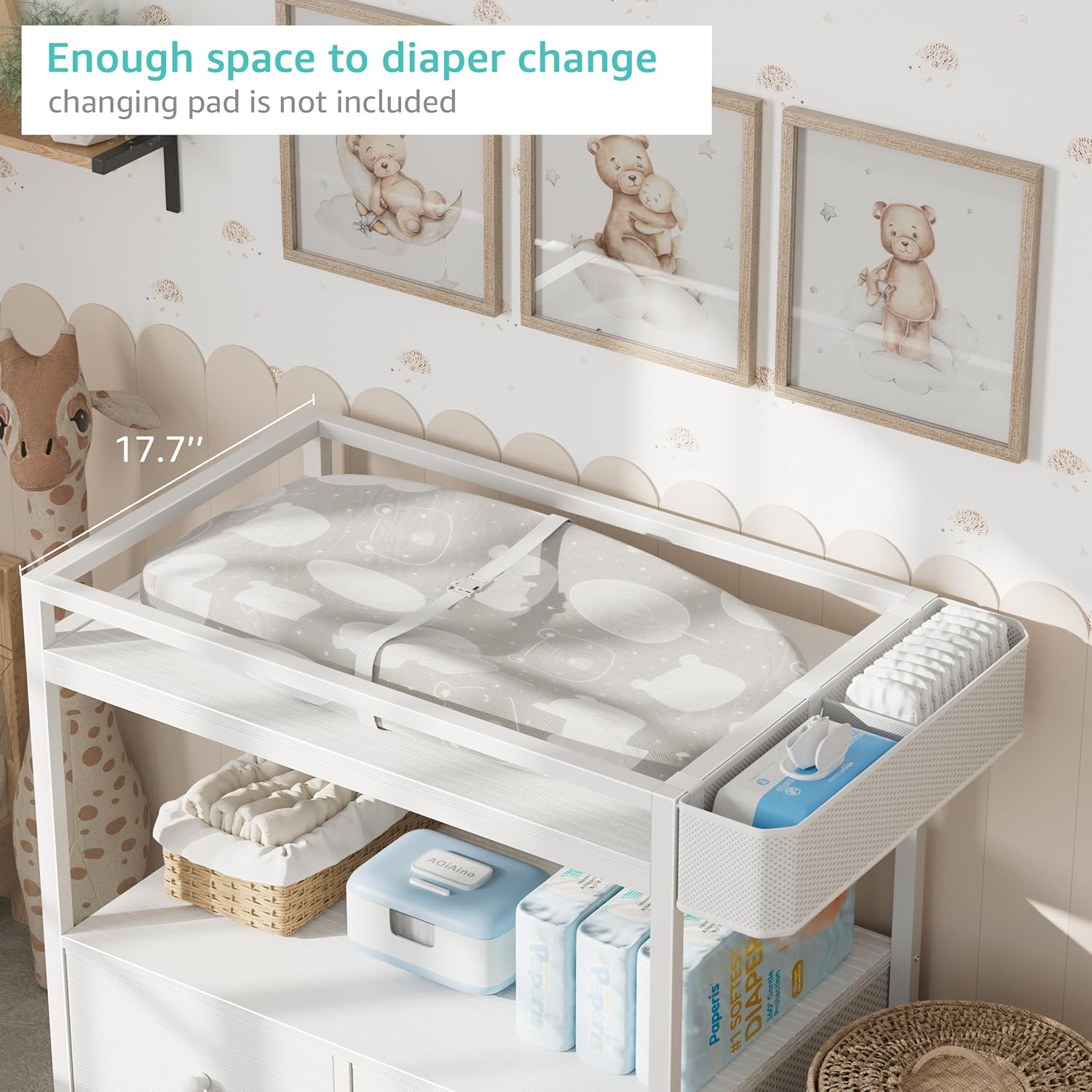 • Spacious Changing Area: The wide 17.7-inch deep top provides ample space for diaper changes, keeping your baby secure and comfortable. When your child outgrows the diaper stage, the top separates easily, converting the unit into a modern dresser.