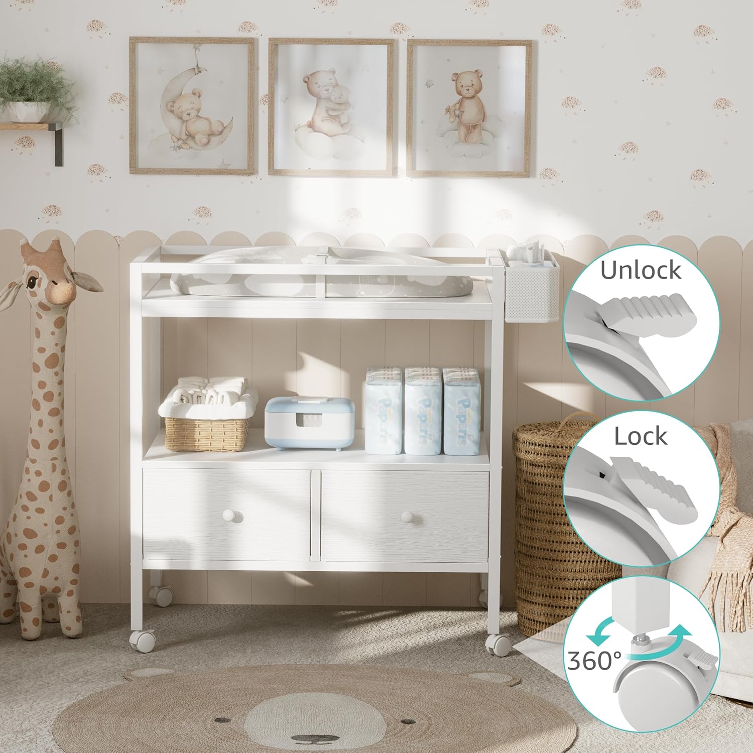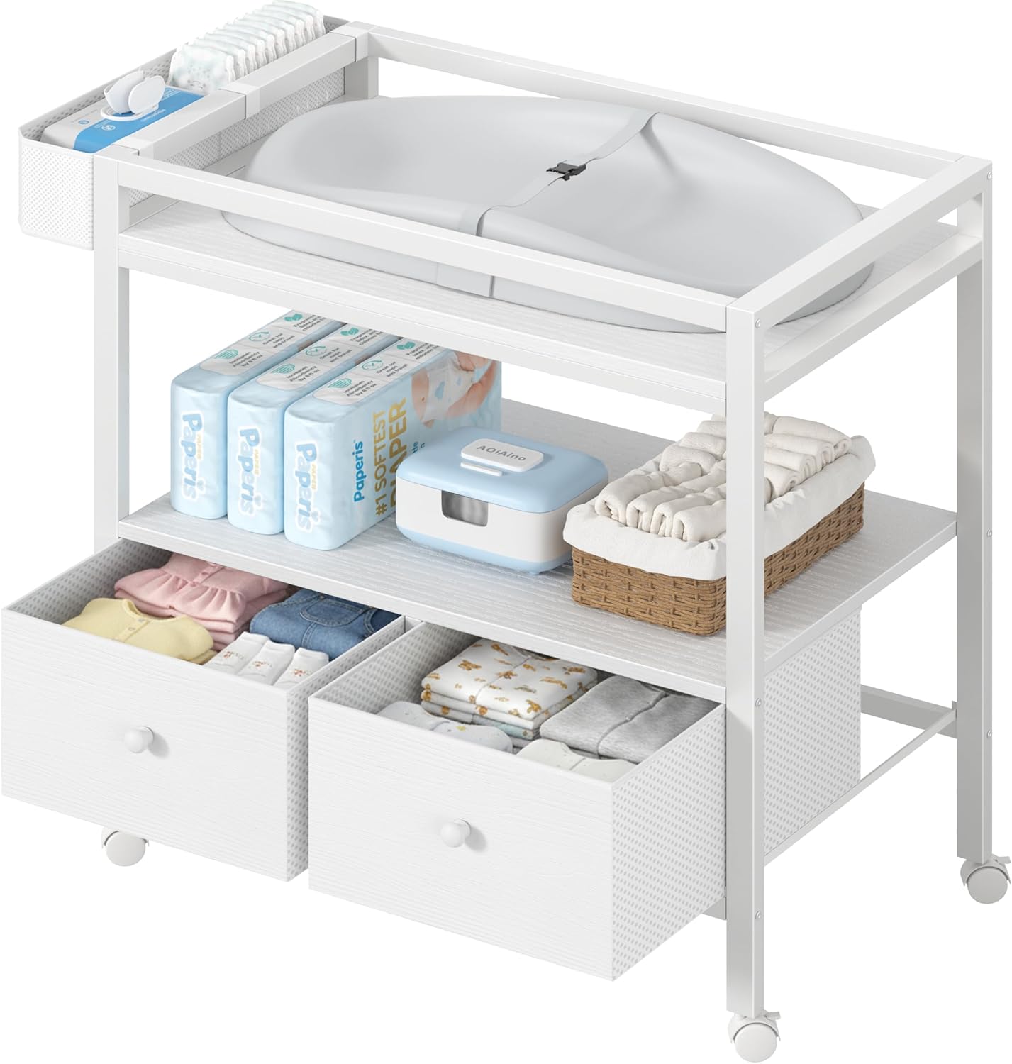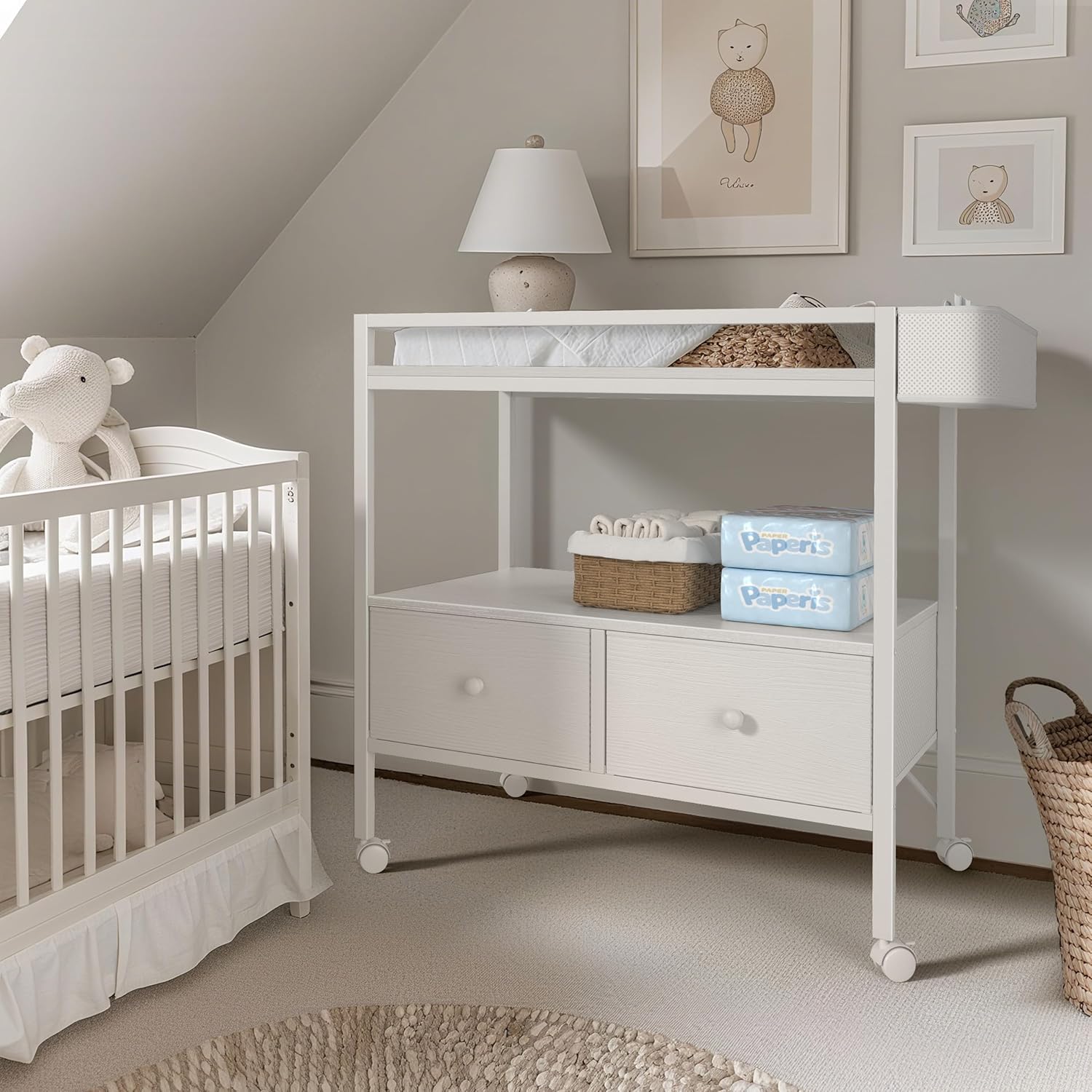 • Maximum Storage Capacity: Keep all your diapering essentials within arm’s reach. Features two deep fabric drawers for clothes or blankets, a large open shelf for lotions and wipes, and convenient side pockets for smaller items like creams or toys.