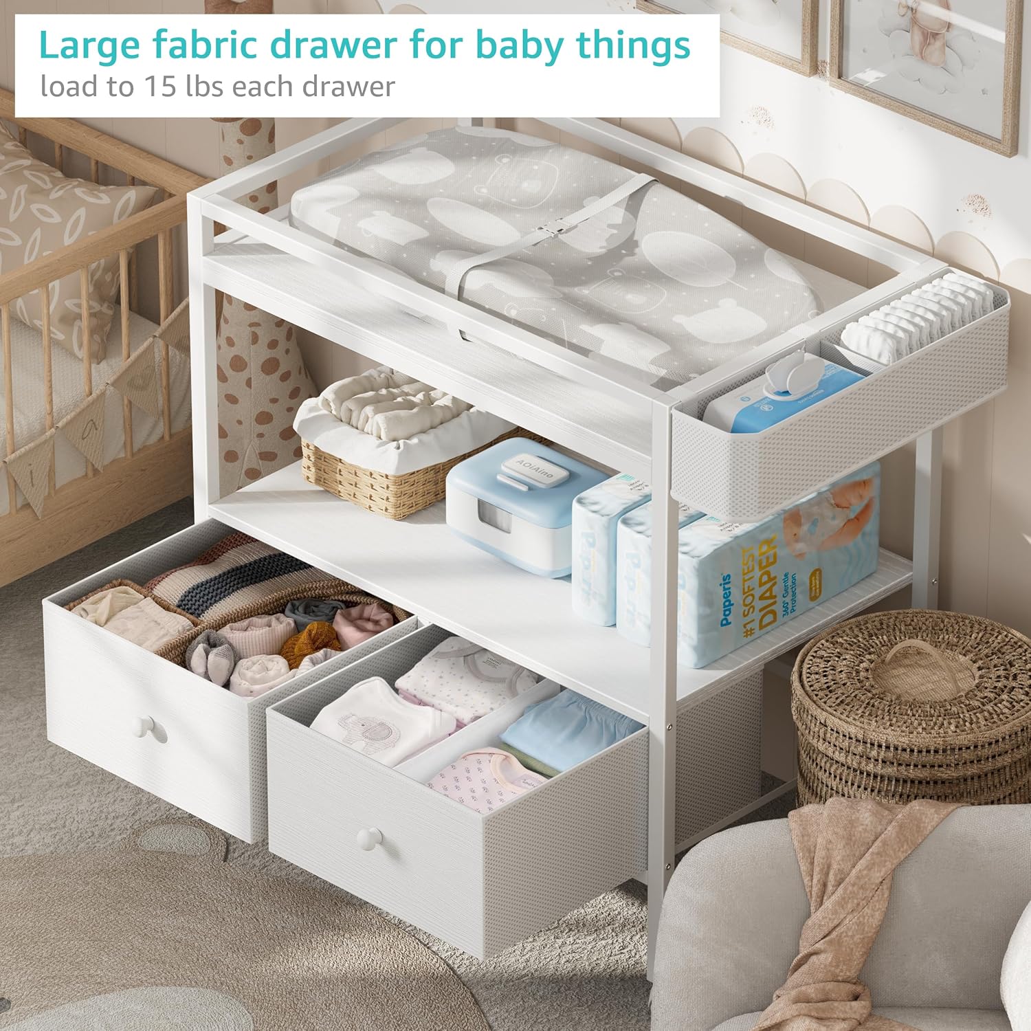 • AMPLE STORAGE SPACE: Includes two deep fabric drawers, a large open shelf, and side pockets to organize diapers, wipes, clothes, and toys efficiently.