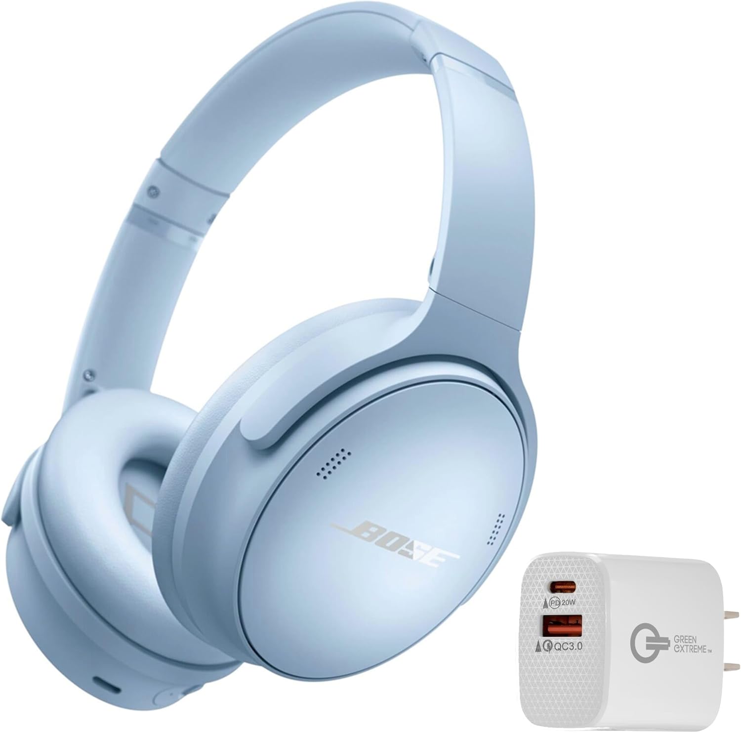 Bose QuietComfort Bluetooth Headphones, Wireless Headphones with Active Over Ear Noise Cancelling and Mic, + Green Extreme 20W 2-Port Wall Charger (Moonstone Blue)