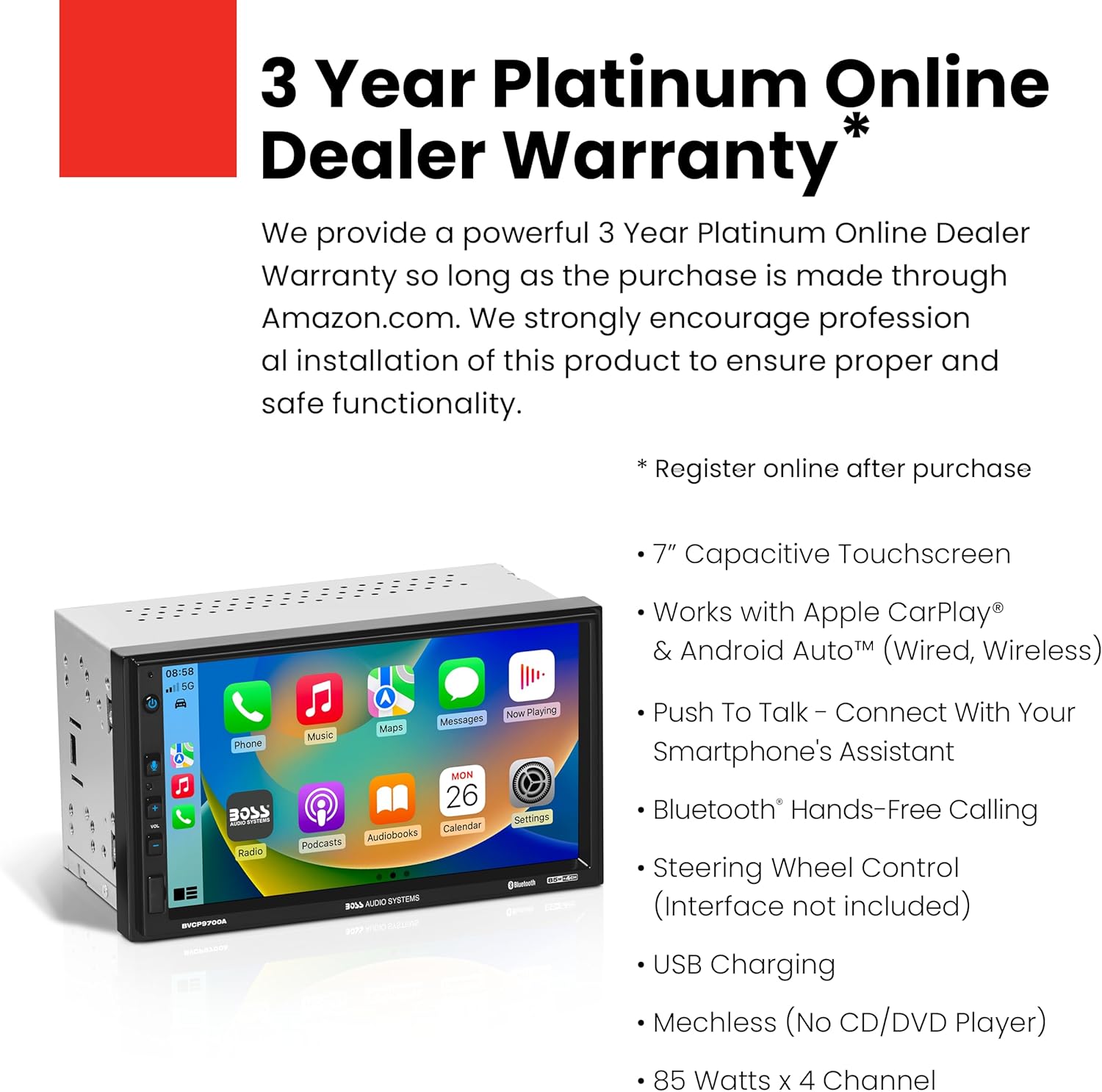 BOSS Audio Systems provides a powerful 3-year platinum online dealer warranty for this unit when purchased through Amazon.com.