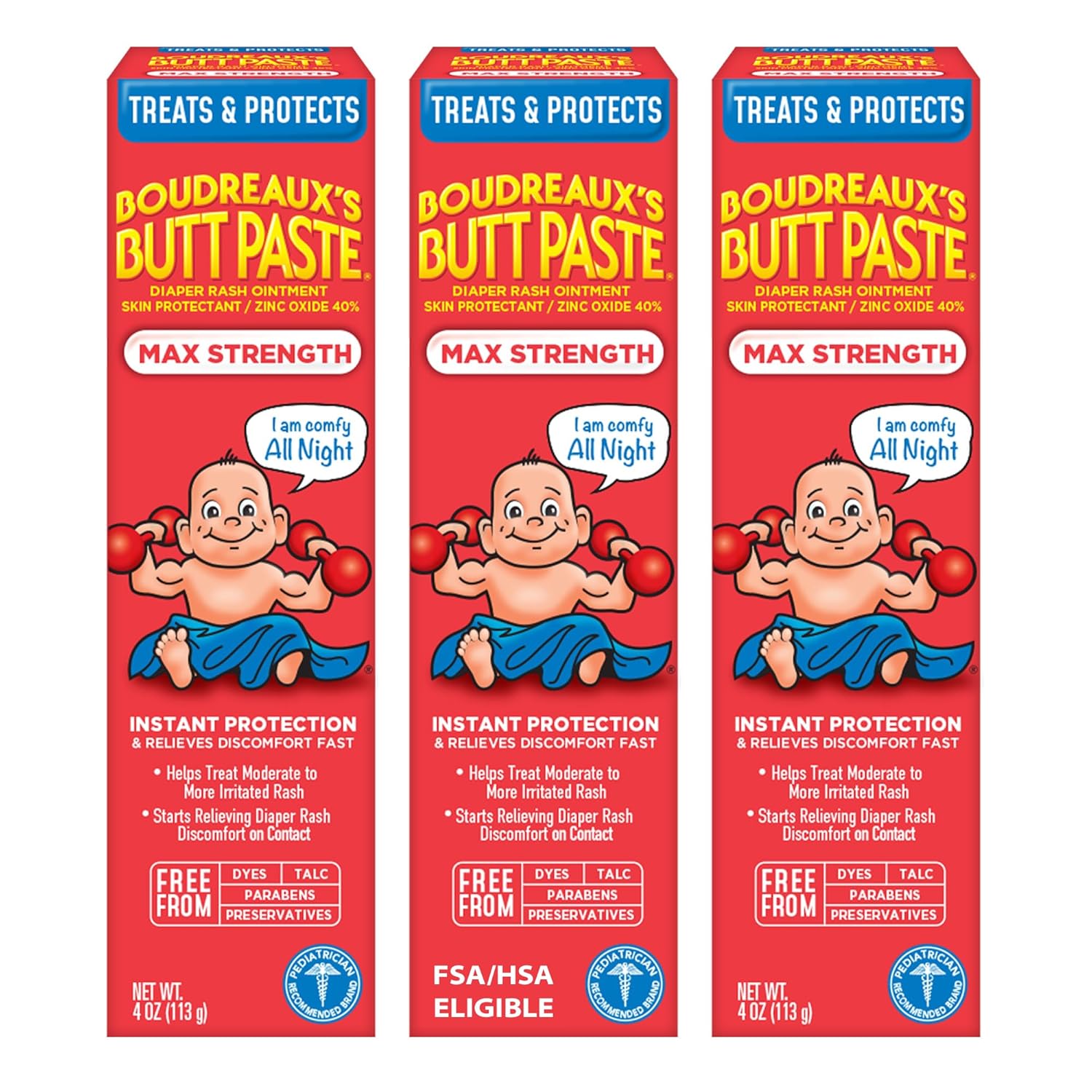 Maximum strength 40% zinc oxide formula provides overnight protection. Free from dyes, parabens, talc and preservatives. Starts soothing on contact, seals out moisture, keeps baby dry. Trusted by pediatricians for over 40 years. 3-pack of 4 oz tubes – perfect for home and on-the-go.