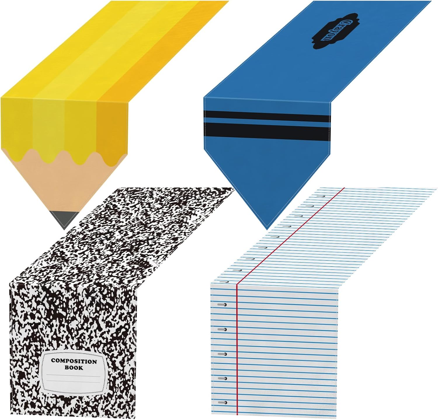 Breling 4-Pack Back to School Table Runner Set – Pencil, Crayon, Ruler & Notebook Designs – Reusable Linen Classroom & Party Decor (72 x 13 Inches)