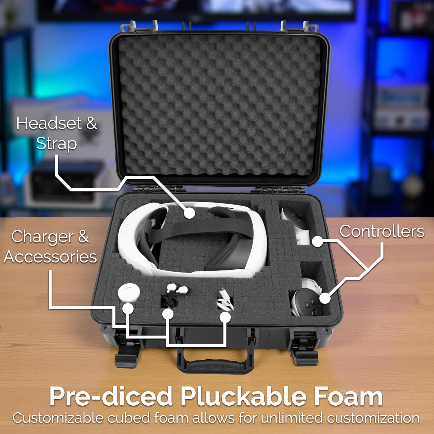**CUSTOMIZABLE DICE FOAM INTERIOR:** The interior features a soft, diced ‘pluck foam’ layer that allows you to create a perfect, custom-fit compartment for your specific headset model, controllers, charging cables, and power adapters. This custom fit prevents your gear from shifting during transit, effectively shielding delicate lenses and screens from scratches and dust. The spacious interior dimensions (14.5” x 10.5” x 4.5”) comfortably fit your headset plus essential accessories.